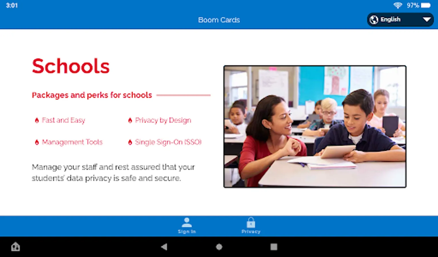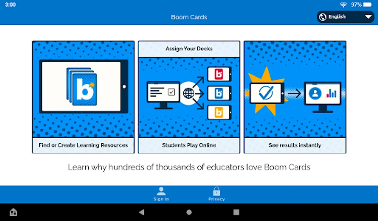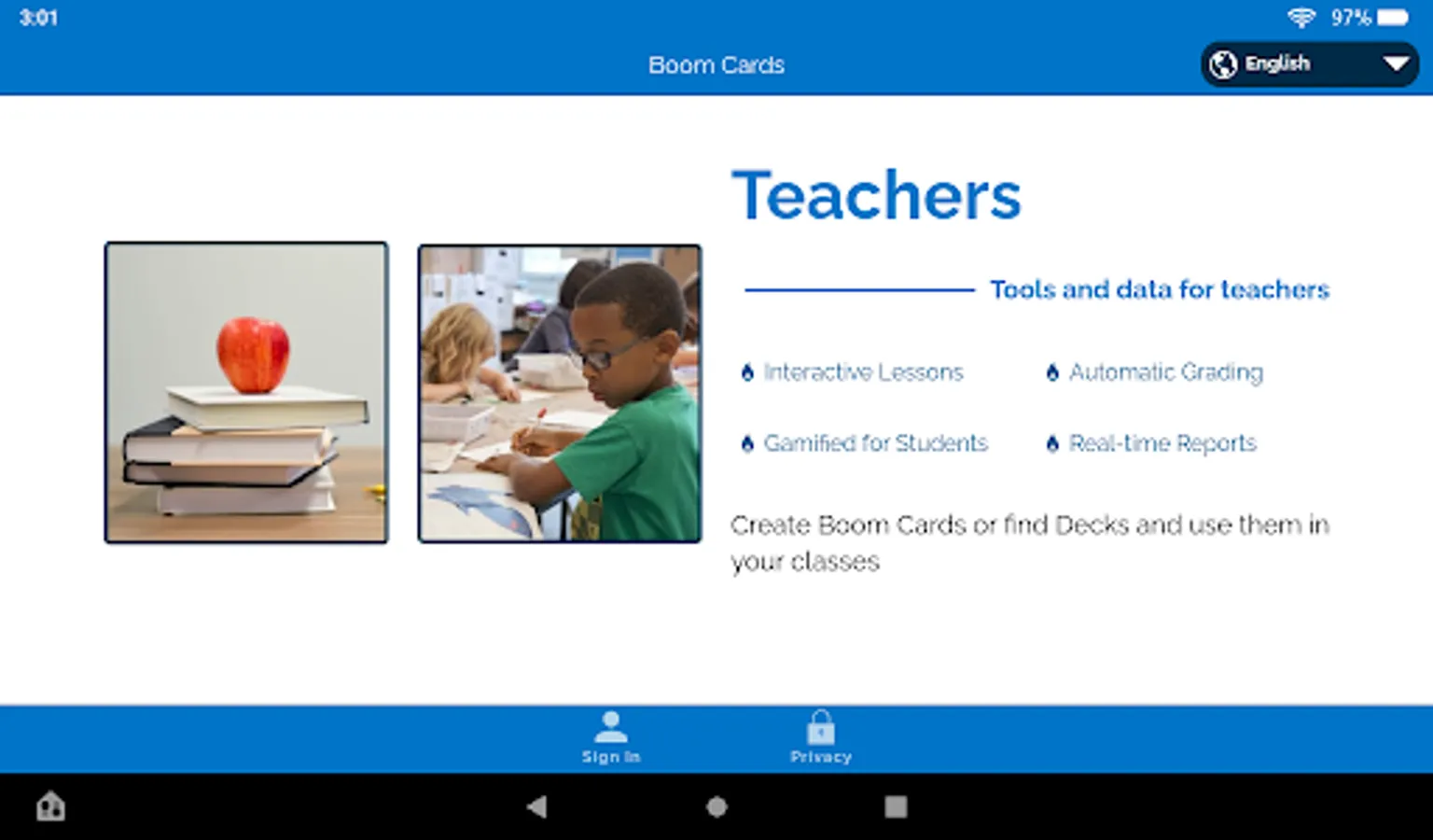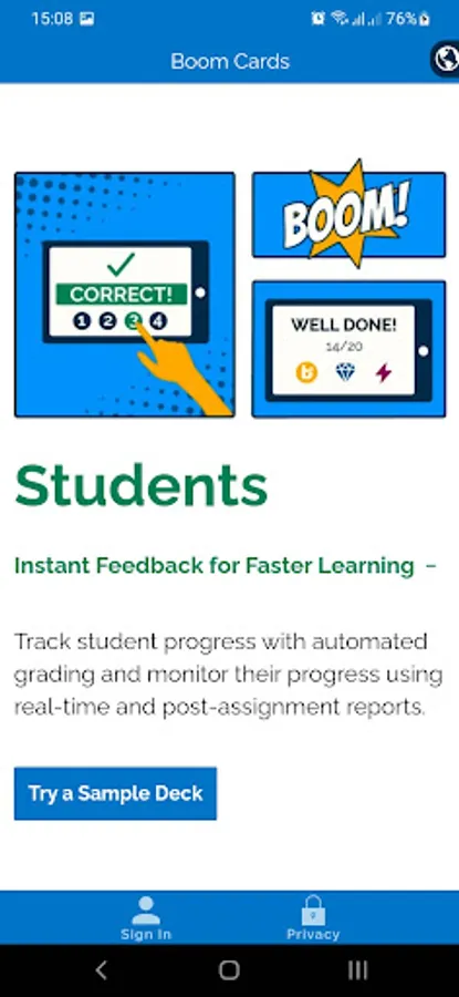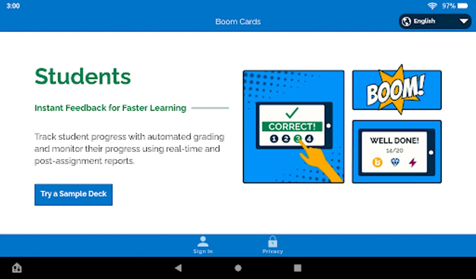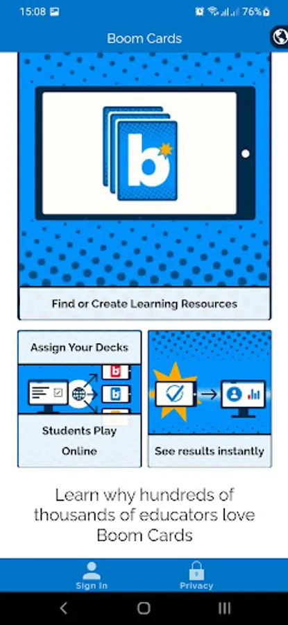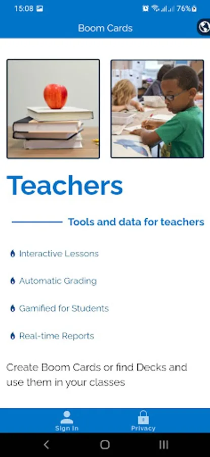 This app enables students to play self-grading Boom Cards on Android devices. It synchronizes with your Boom Learning classroom. From the app, teacher account holders can assign materials to classes and review student performance.