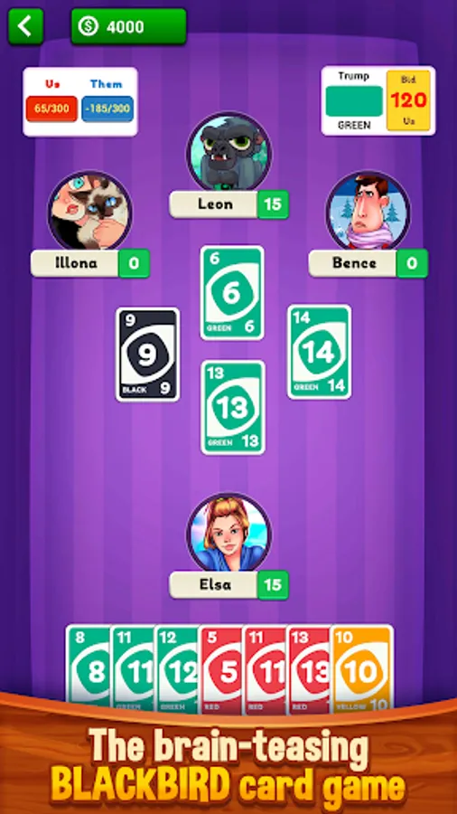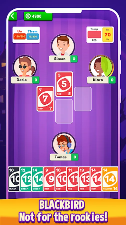 Blackbird is a game of 4 players involving two teams. Partners sit opposite each other. Game is played clockwise. Deck consists of 41 cards. There are four suits: Black, Green, Red, and Yellow. There are 10 cards in each suit, numbered from 5 to 14. There is one Blackbird card. The Blackbird card is worth 20 points. Each 14 and 10 cards are worth 10 points. Each 5 cards is worth 5 points. The rest of the cards are not worth any points. The 14 numbered cards of any suit is the highest card of that suit followed by the 13 cards down to the 5 cards.