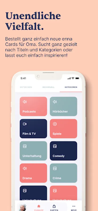 The enna app runs on the smartphones of the relatives and is the digital bridge to grandma and grandpa. The app can be used to share moments together, start video calls or schedule appointments. At the same time, new content for grandma and grandpa can also be ordered in our enna store. The card will be printed and sent directly by post.