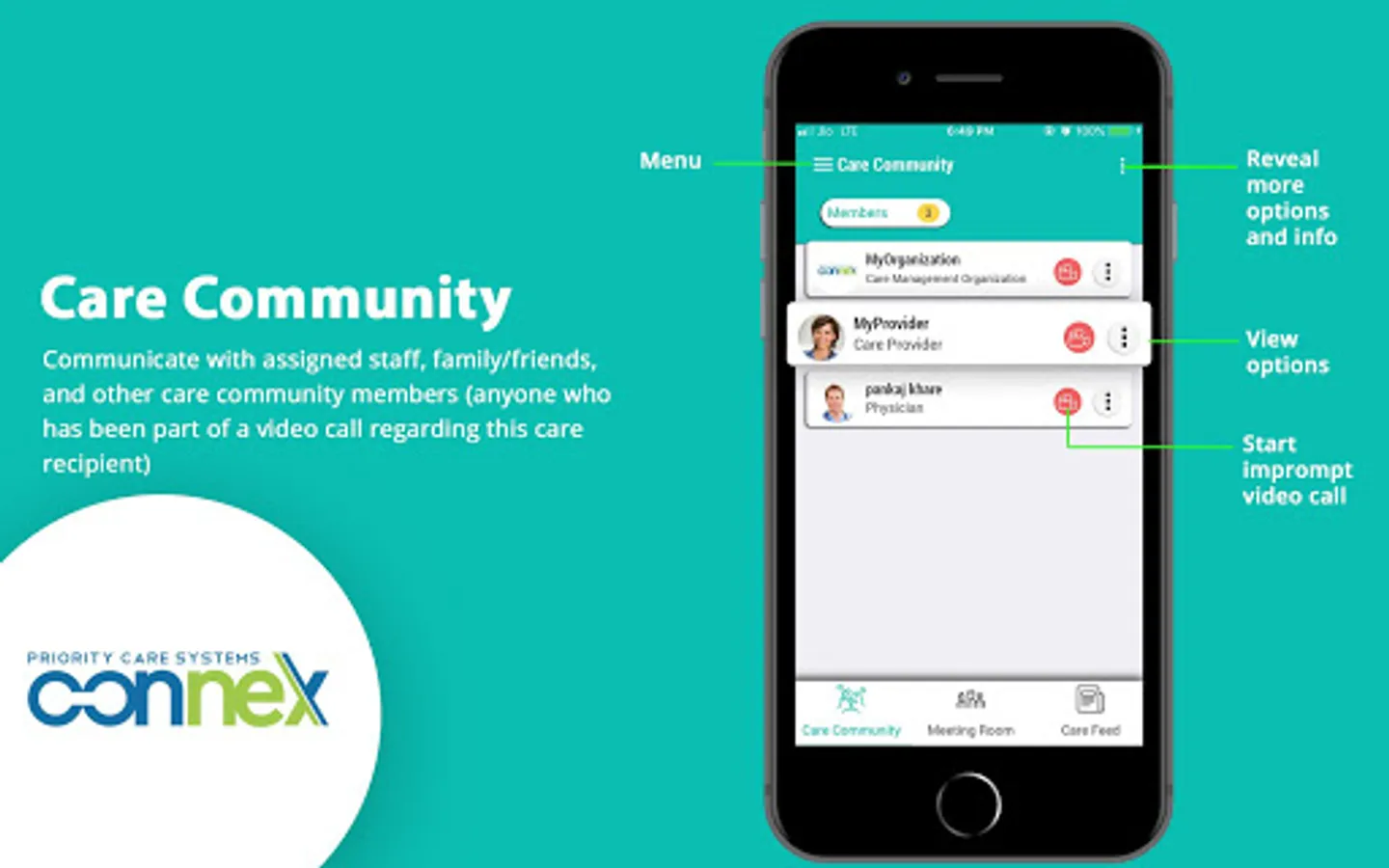 PCS Connex enables healthcare organizations, providers, volunteers and charity organizations to manage the care of their patient population. Patients can manage their day-to-day activities, request care, keep a track of their vital readings like blood pressure, heart rate etc., request their care community for assistance, document their medications and connect to the care provider network through secure multi-party video calls. Physicians, home care companies, and care managers around the world use the mobile functionality of our app to keep an eye on their patients, monitor them, keep them engaged and always be available through telehealth, messaging, and instant reach video calls. Our App is an extension of our doctors care plan, bringing mobile functionality into your care initiatives.