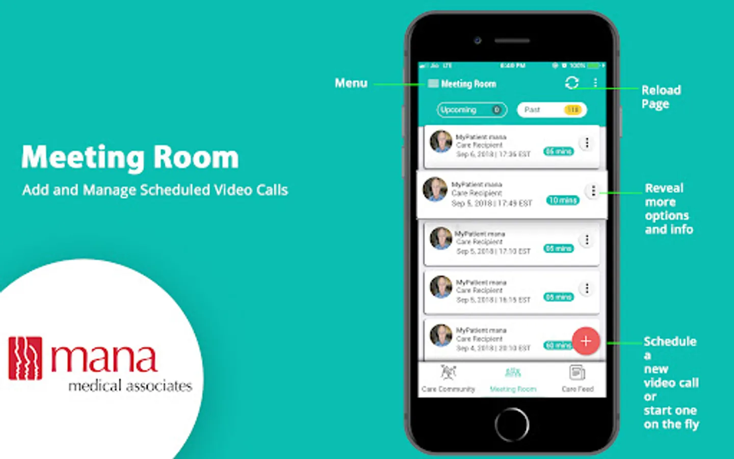 ◦ See all upcoming and past video calls with patients and caregivers