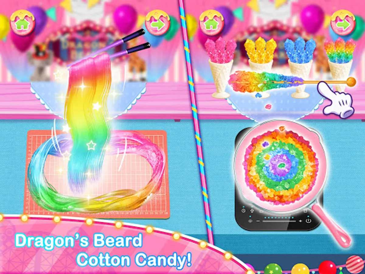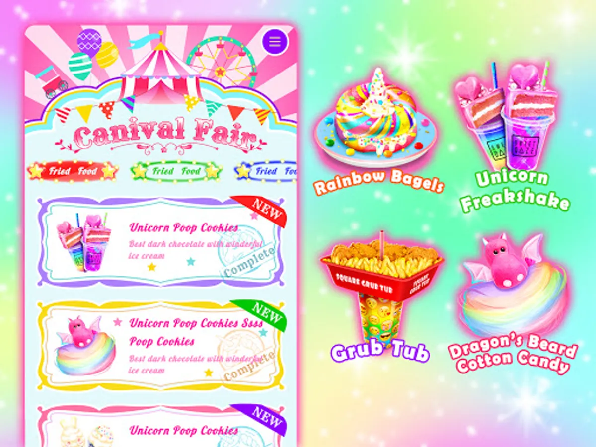- Cook yummy carnival fair foods such as unicorn chef cake, cotton candy, pogos, ice cream, rainbow slushy, classic American hot dog, French fries, fried noodles, corn dogs, popsicles, crispy donuts and so much more in this carnival game