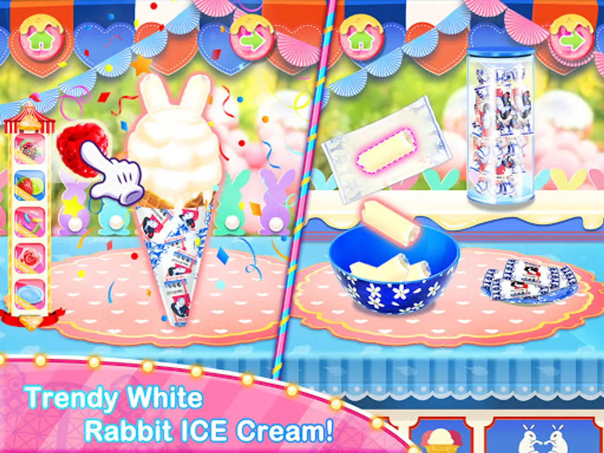 - Tons of food materials and decorations to try: sausages, bread, chickens, potatoes, fruits, candies, sprinkles, milk, flour, salt, butter, eggs, food coloring, ice cream, cream, water, rock candies, white rabbit candy, unicorn chef decorations and so much more in this carnival game
