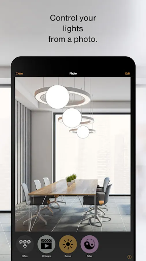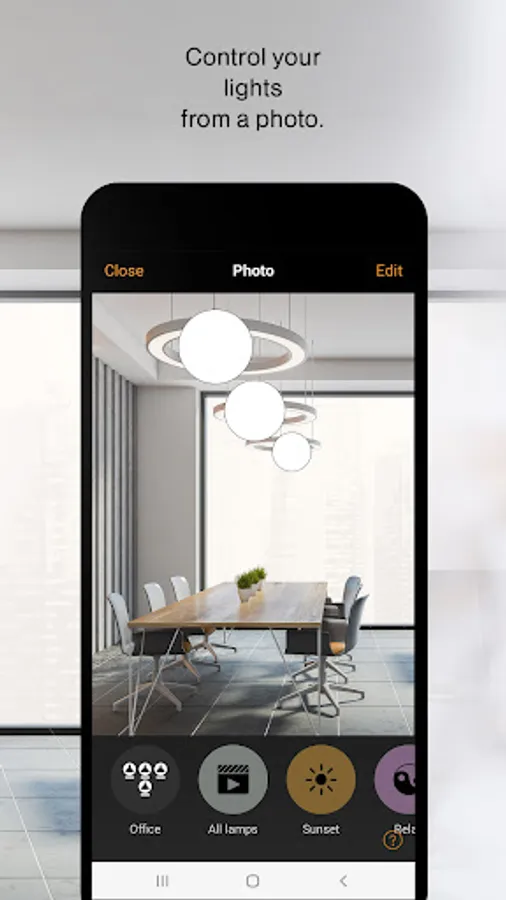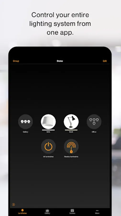 The app allows you to control lighting visually from a photo. Simply take a photo of the room in which the lights you wish to control are, upload it to the Gallery, and drag the desired control commands over the lighting fixtures within the picture. No need to remember which luminaire is which, you have a visual guide for decision-making ease.