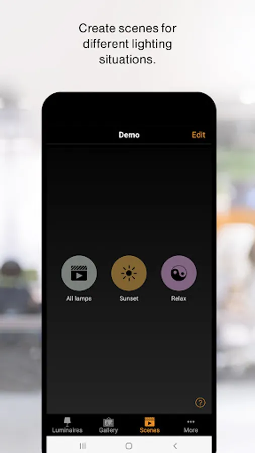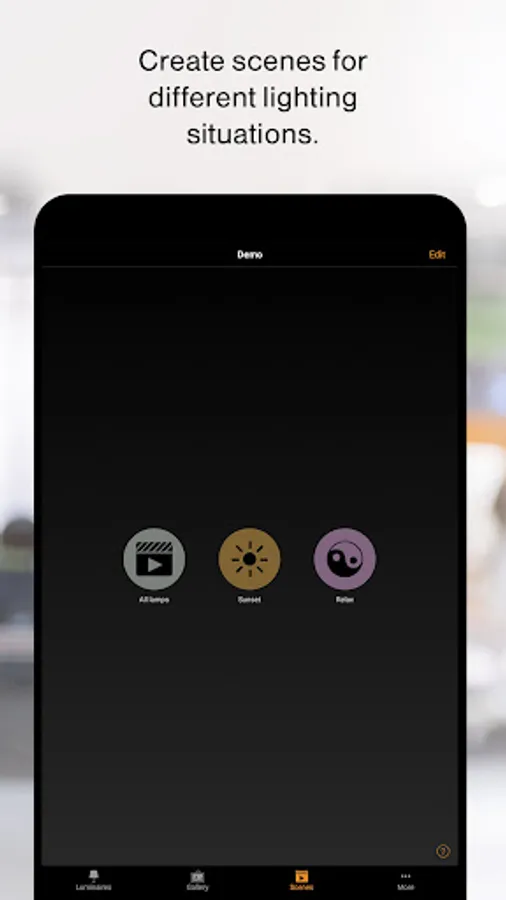 The Scenes tab allows you to create and recall personalized lighting set-ups. One scene can control any variation of luminaires in your network, and luminaires can be used in multiple scenes. From simple lighting scenarios (such as circadian or daylight scenes) to animated and timed scenes, virtually any set-up can be configured, saved, and recalled in the app.