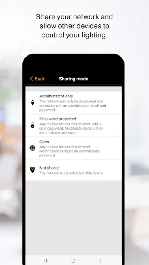 It is possible to control access rights to your lighting network and to define who interacts with it. An assigned ‘administrator’ can make all network changes and give access rights to new users. A ‘manager’ can make changes to all lighting control functionalities but cannot get access to passwords or decide who can access the network. A ‘user’ can only use the network but not make any changes.
