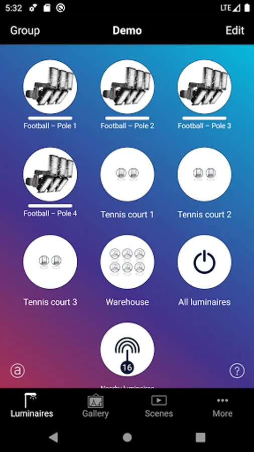 With ITERRA app you can control all your lighting fixtures with one simple view. It is possible to control your lights individually or as a group. For example, you can create a group for your football training pitch, your main tennis court, your car park, and turn them all off / on with just one tap. You can also dim the light in your sports facilities depending on the requirements (match, training, maintenance).