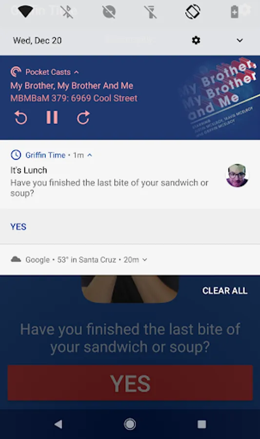The app is designed to be exist and function solely as a notification (though there is also an app screen for your enjoyment). Simply launch the app once to turn on the notification, then use the notification's "YES" action (available in the notification's expanded view) to advance the time whenever the criteria for the next time has been met. The notification can be disabled or made dismissible via the app's setting page (accessible via the gear icon on the top right of the app screen).