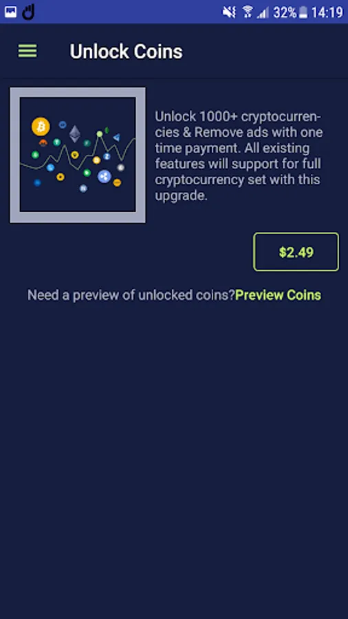 ∆ Unlock Coins: $1.99 One time payment to remove ads and unlock 1500+ cryptocurrencies for portfolio tracking, price data and charts. All existing features will be expanded to full set of cryptocurrencies with this purchase. You can also preview the locked coins list before making the purchase. We would suggest this as a good option for intermediary cryptocurrency investors.