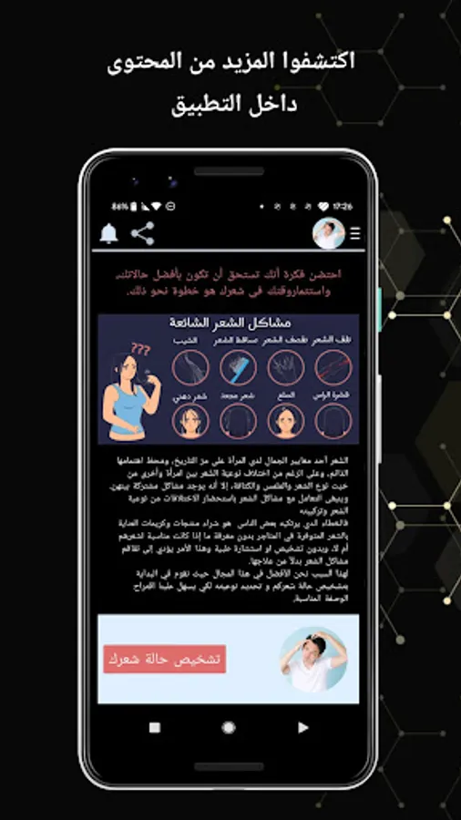 The special hair loss treatment application is a specialized application that aims to provide users with the necessary information and useful advice to deal with the problem of hair loss. This app features a comprehensive set of useful and reliable content to help people understand the causes and factors of hair loss and provide the necessary steps to take care of their scalp and hair.