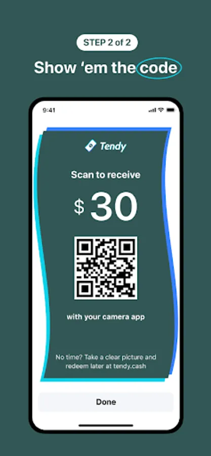 Enter the amount you want to pay or tip, and Tendy will generate a code that's as good as cash! Just show your screen to the recipient and tell them to scan in their Camera app. They do not need to download the Tendy app.