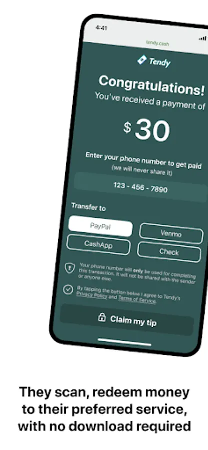 Tendy works like cash. You can use it to quickly pay someone, or give someone a tip, without having to exchange personal info like your name, phone number, or email.