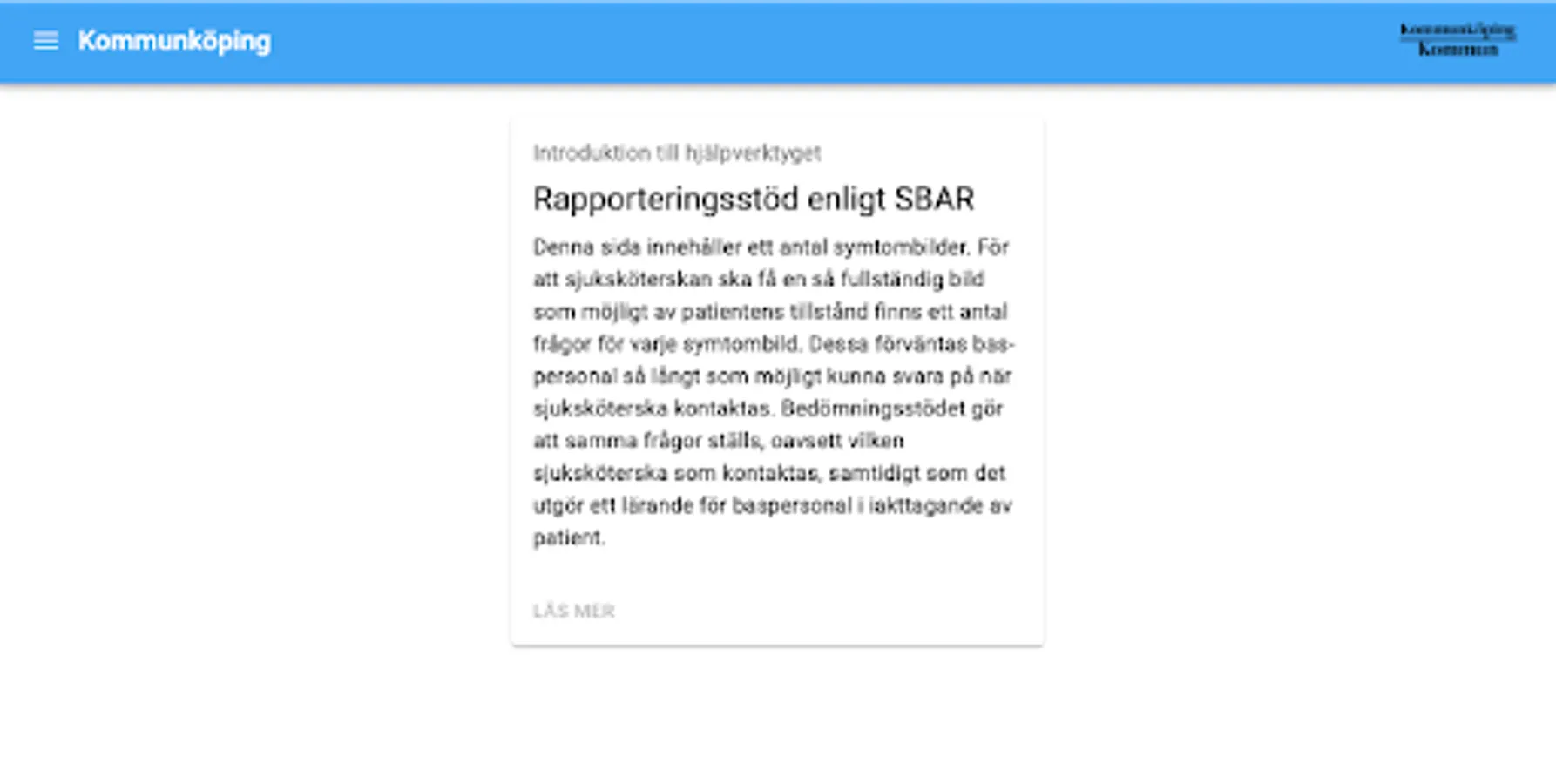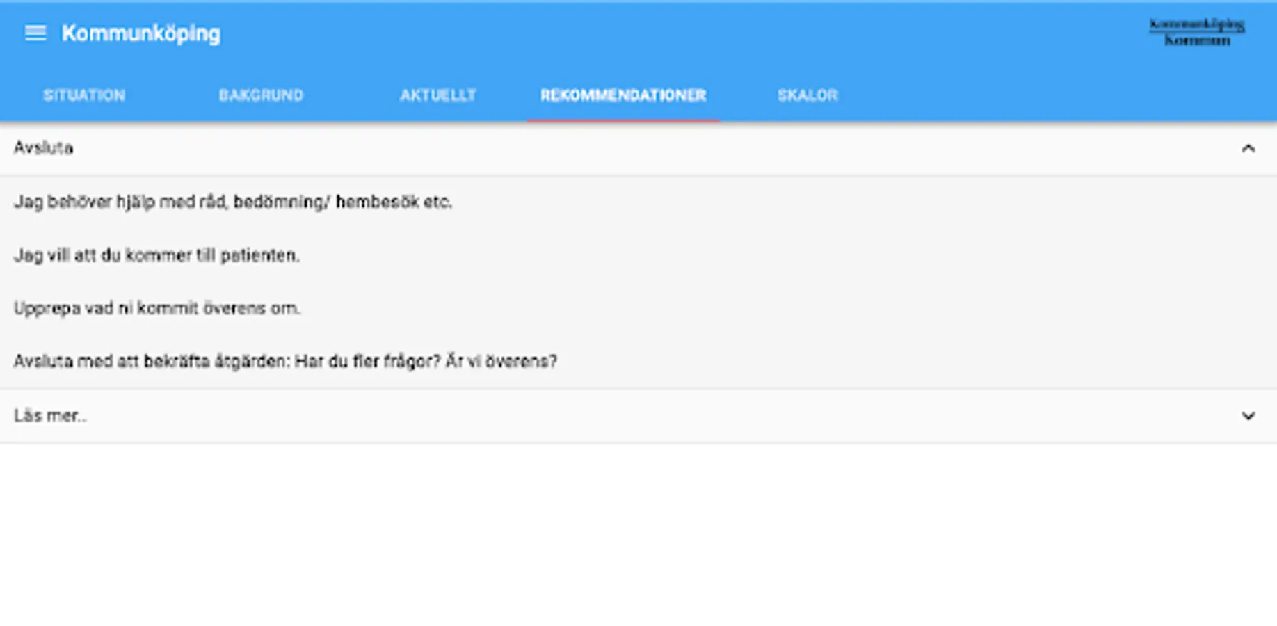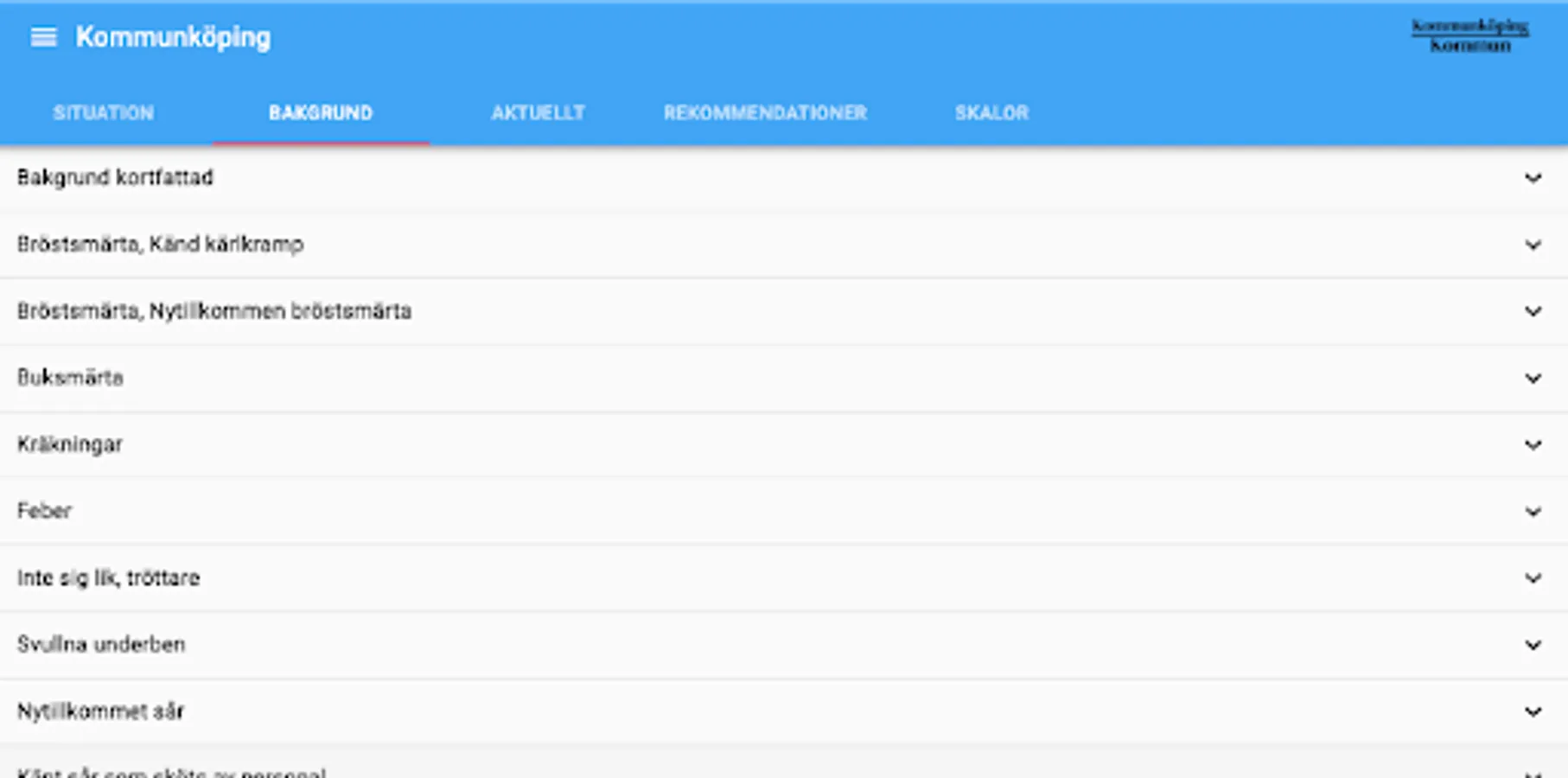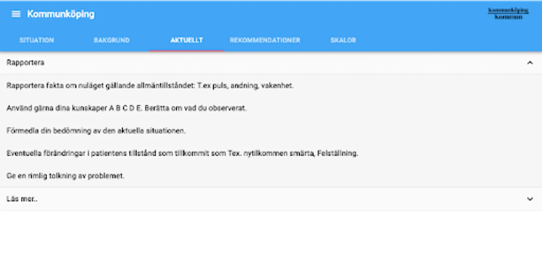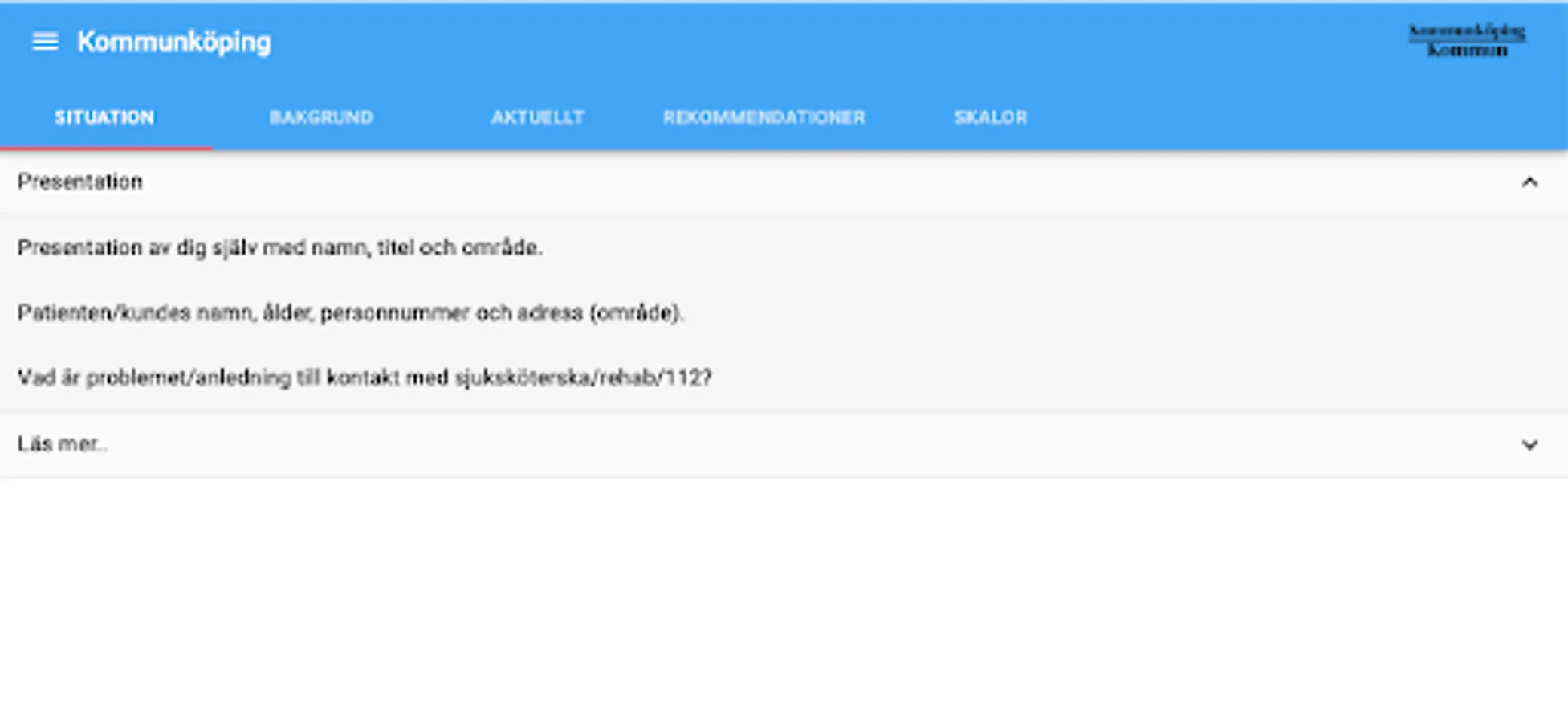 This page contains a number of symptom pictures. In order for the nurse to get as complete a picture as possible of the patient's condition, there are a number of questions for each symptom picture. These basic staff are expected to be able to respond as far as possible when the nurse is contacted. The assessment support means that the same questions are asked, regardless of which nurse is contacted, at the same time as it constitutes learning for basic staff in observing the patient.