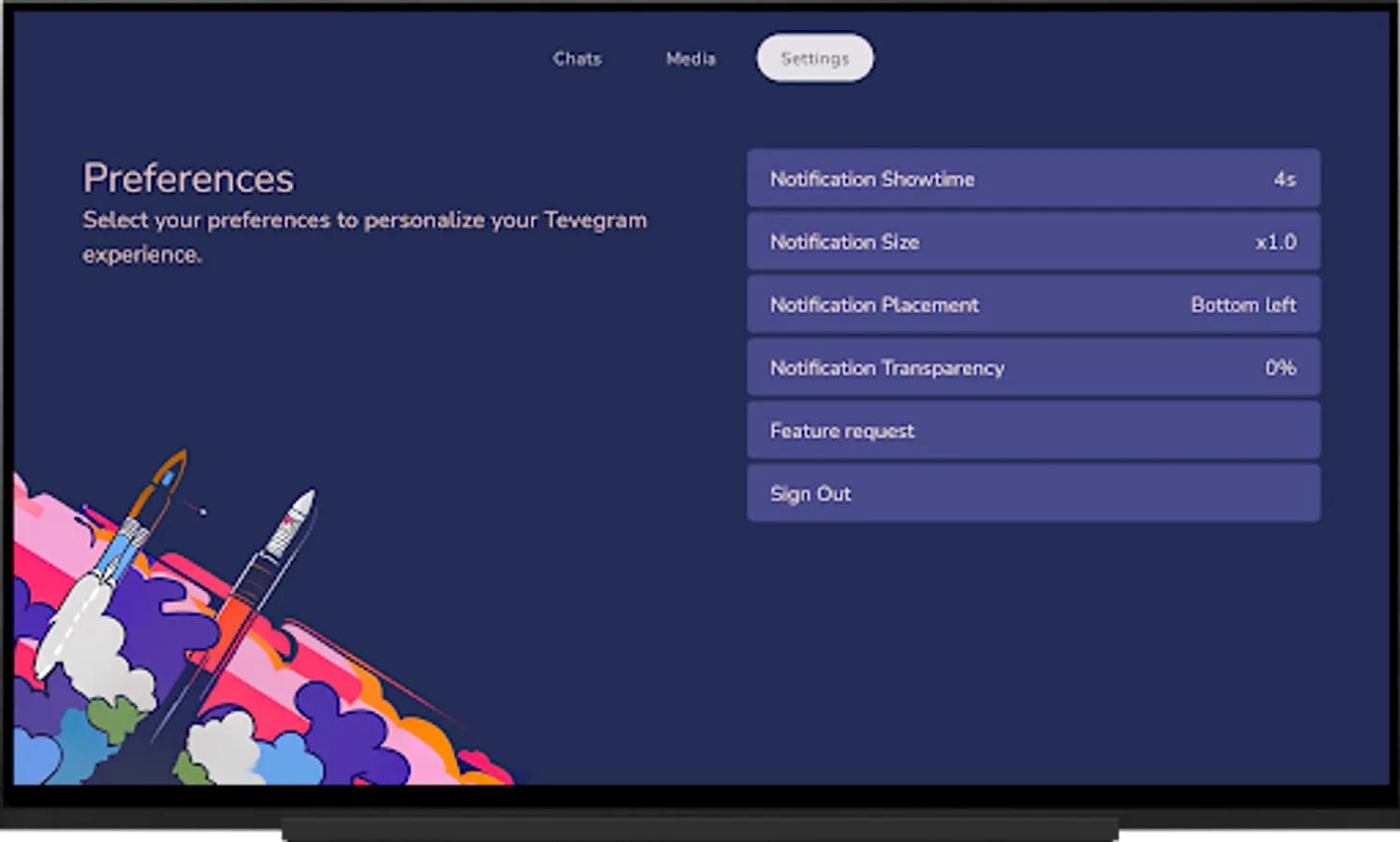 Welcome to Tevegram : Telegram for TV - an unofficial, tailor-made Telegram client designed exclusively for Android TV, reinventing the way you interact with Telegram features.