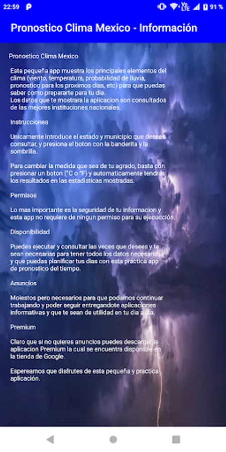 This small app shows the main elements of the weather (wind, temperature, probability of rain, forecast for the next few days, etc) so you can know how to prepare for your day.