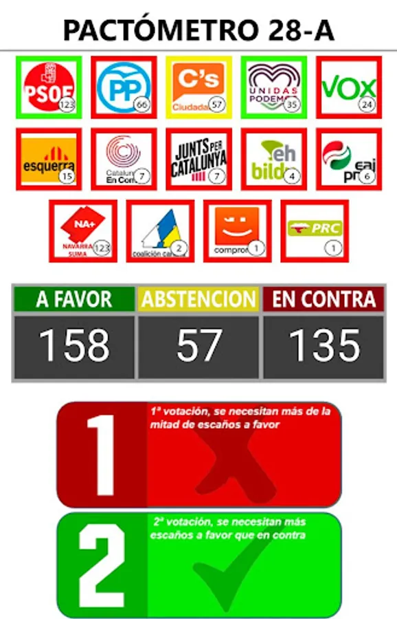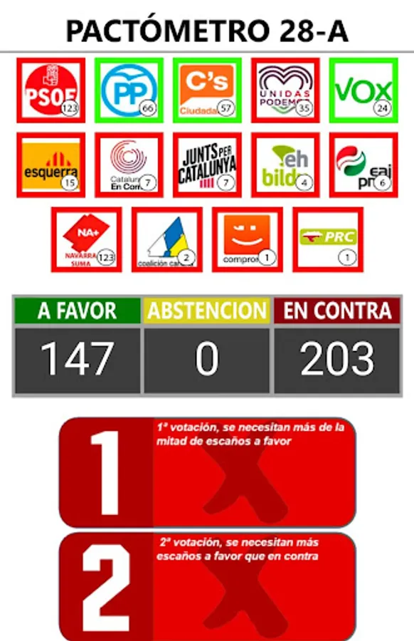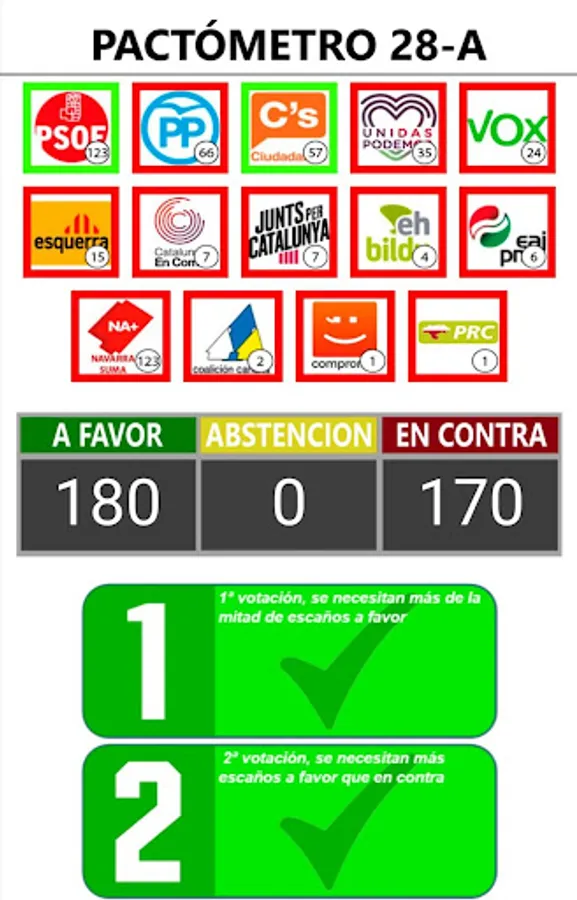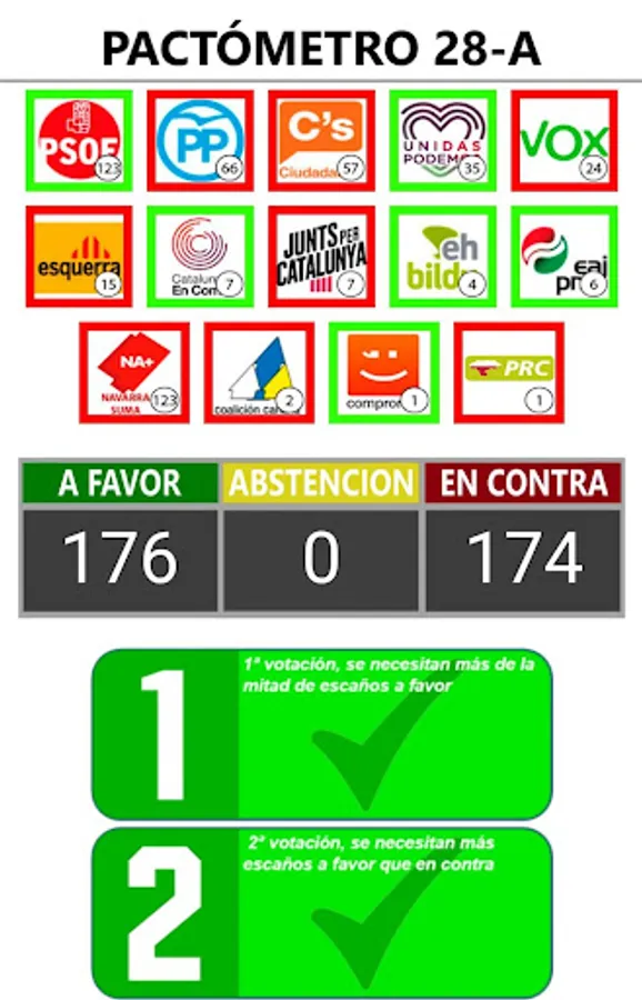 Check all possible combinations between political parties with the results of the general elections of 28A. Get the results of both the first and the second vote that would be held in Congress, and leave doubts quickly and easily.