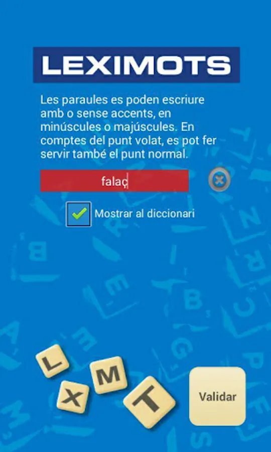 - Validator: pot comprovar one paraula or diverses (separades per un espai). paraules (or correctes jugades) Les is marked in Green, i incorrectes them in vermell. If significat vol consult the paraula, hi has habilitat one directe enllaç three diccionaris catalans of reference (línia).