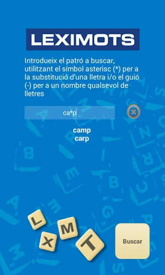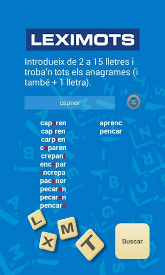 - Anagramador: amb them lletres that ofereixen li, troba them jugades possibles i amb amb totes elles one month lletra, creant one llista of fins 50 paraules. The extra lletra vermella és per a distingir-la at first sight.