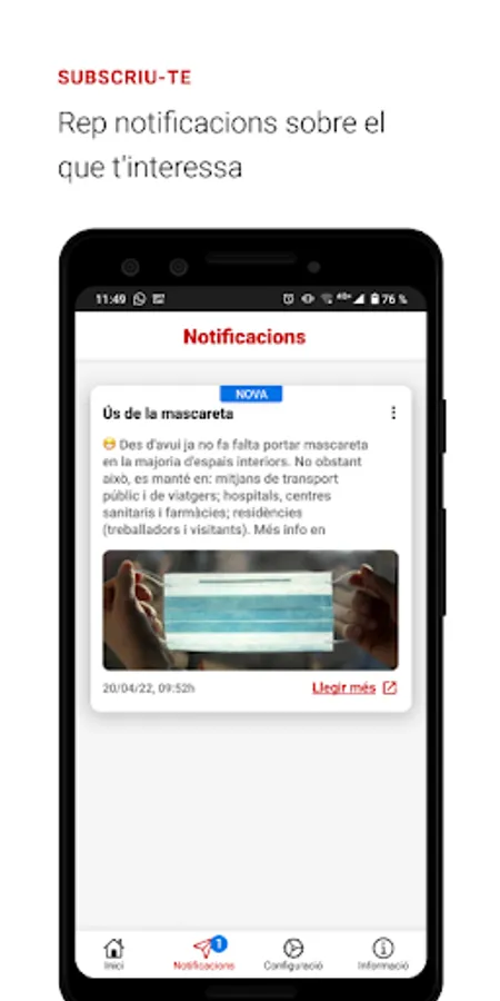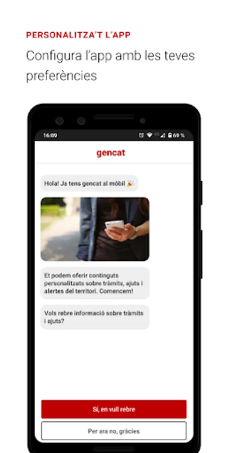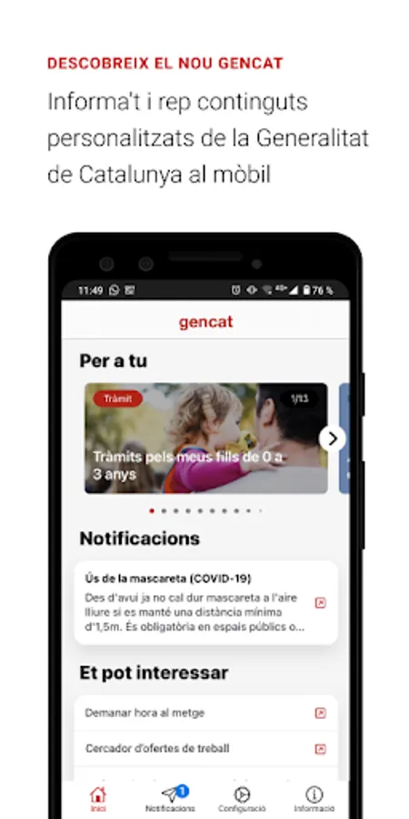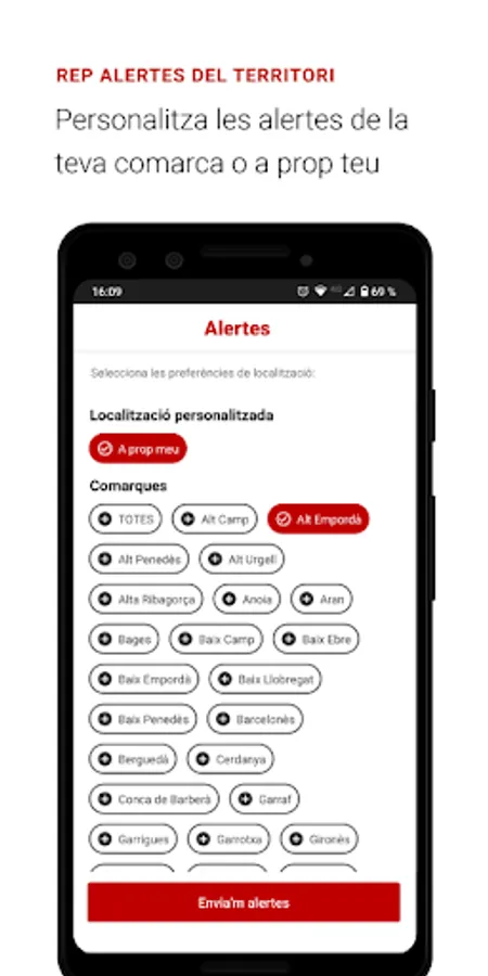 The gencat app offers personalized content and notices about procedures and grants depending on the preferences that are selected. It also allows you to subscribe, by geolocation or by counties of interest, to the relevant alerts of the territory related to health, risk of floods, episodes of pollution…