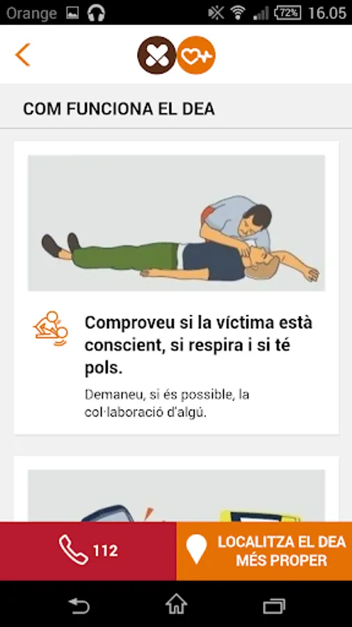 Locate on a map the defibrillator (AED) and calls the nearest emergency services (112) to warn of a cardiac arrest.
