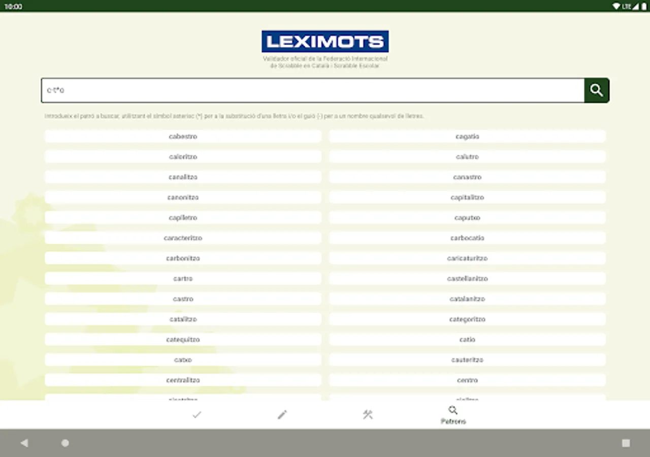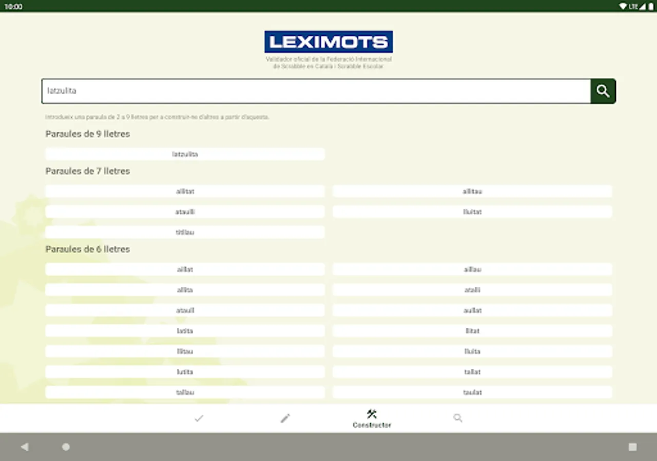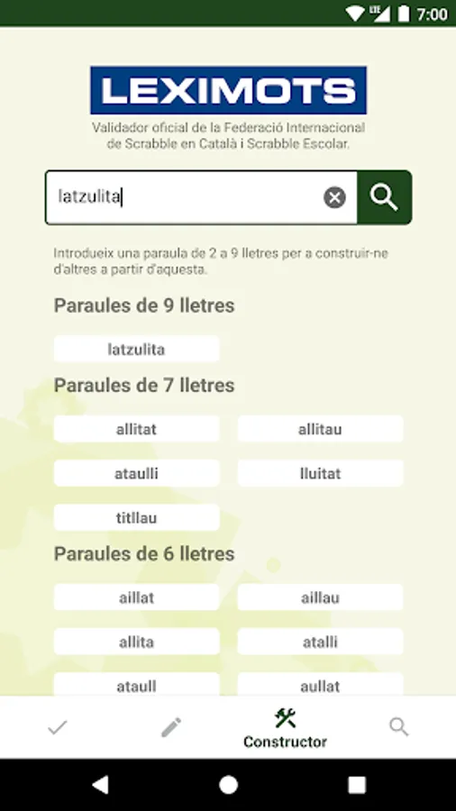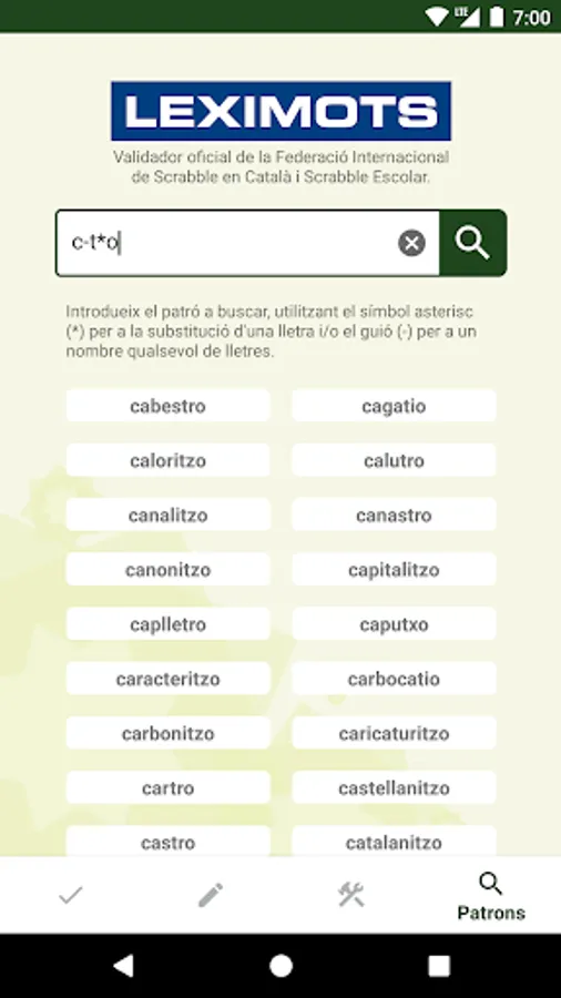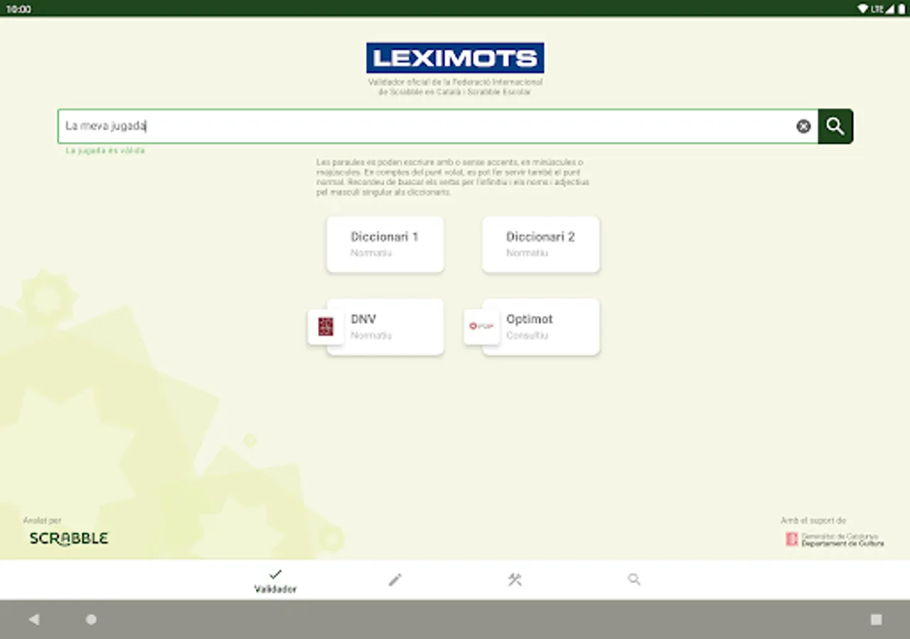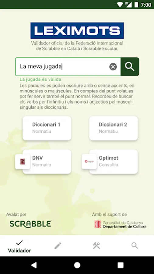 - Validator: you can check a single word or several (separated by a space). The words (or correct plays) are marked in green, and the incorrect ones, in red. If you want to consult the meaning of the word, there is a direct link to four Catalan reference dictionaries (online).