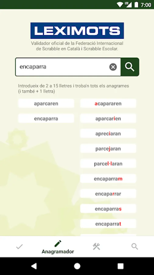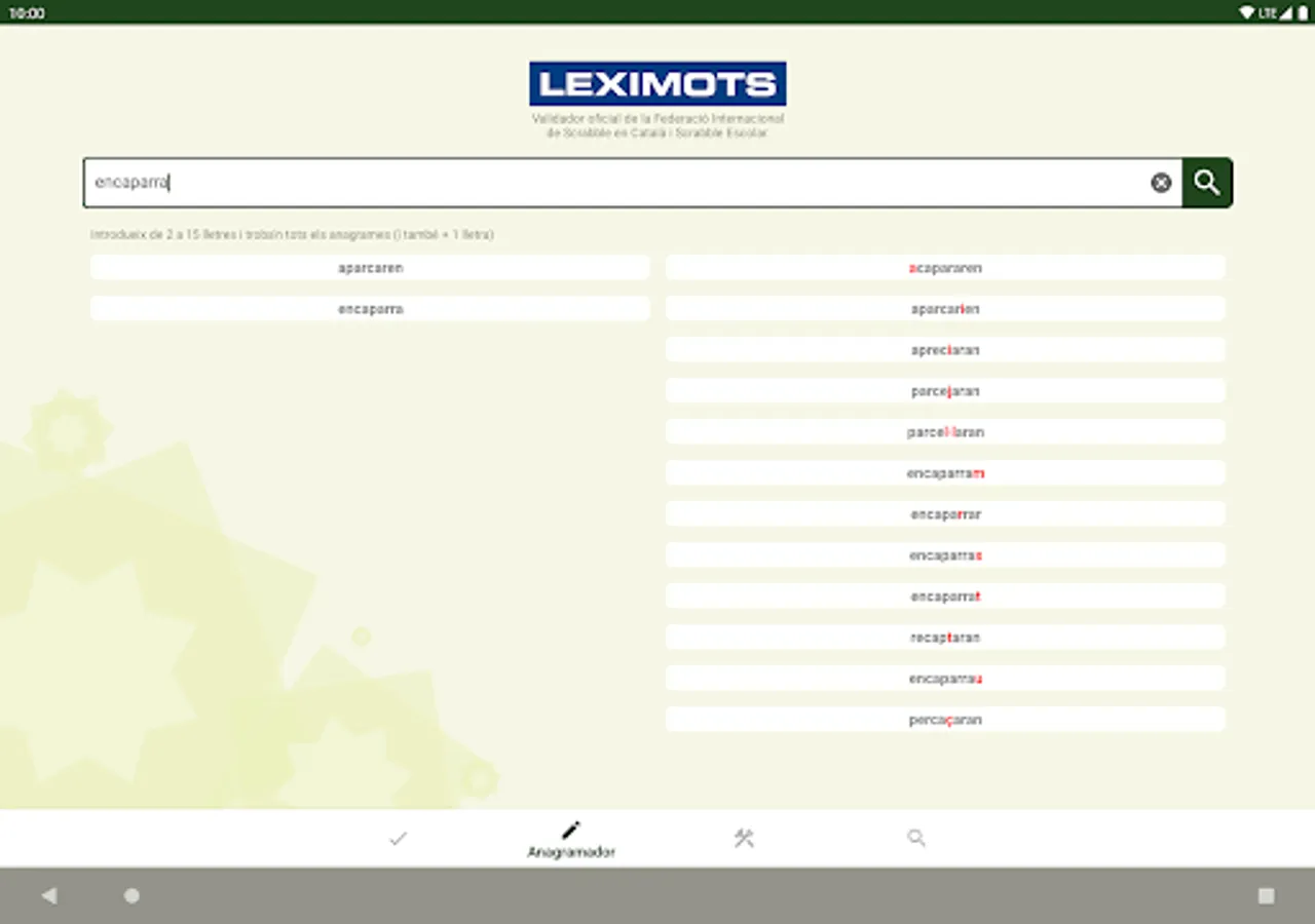 - Anagrammer: with the letters offered to him, find the possible plays with all of them and with one more letter, creating a list of up to 50 words. The extra letter is red to distinguish it at first glance.