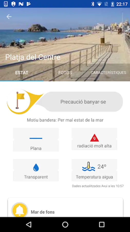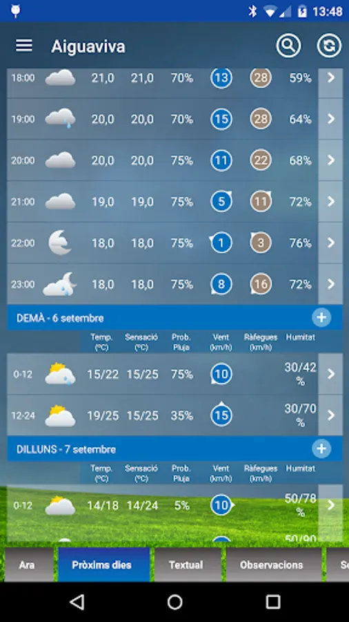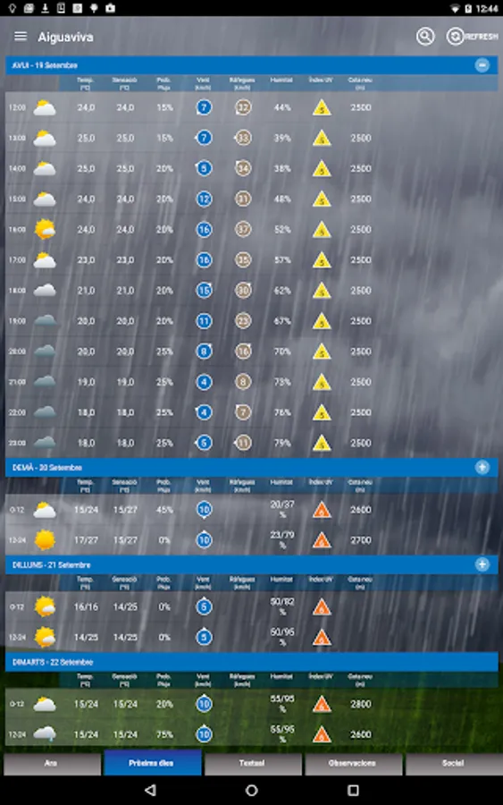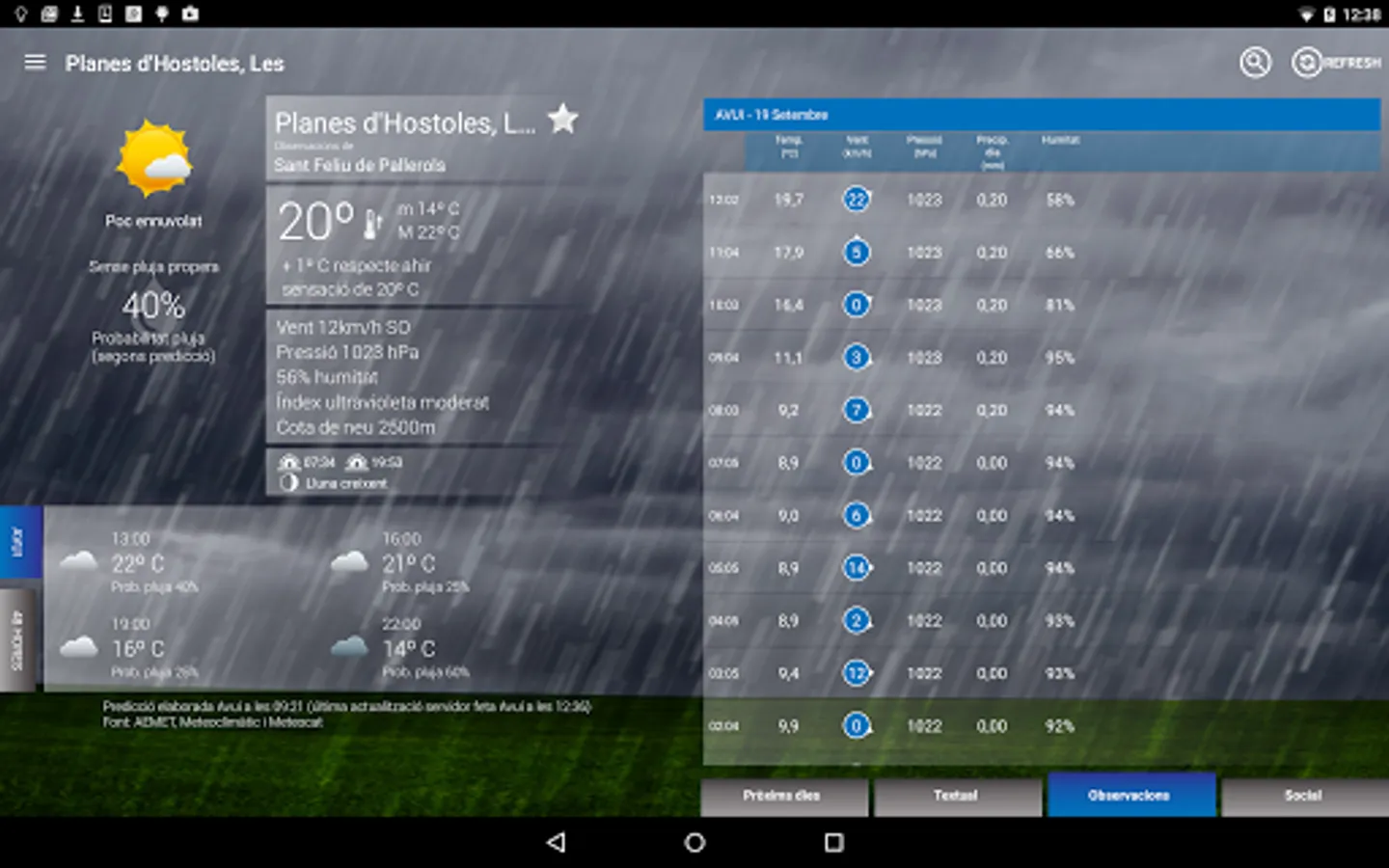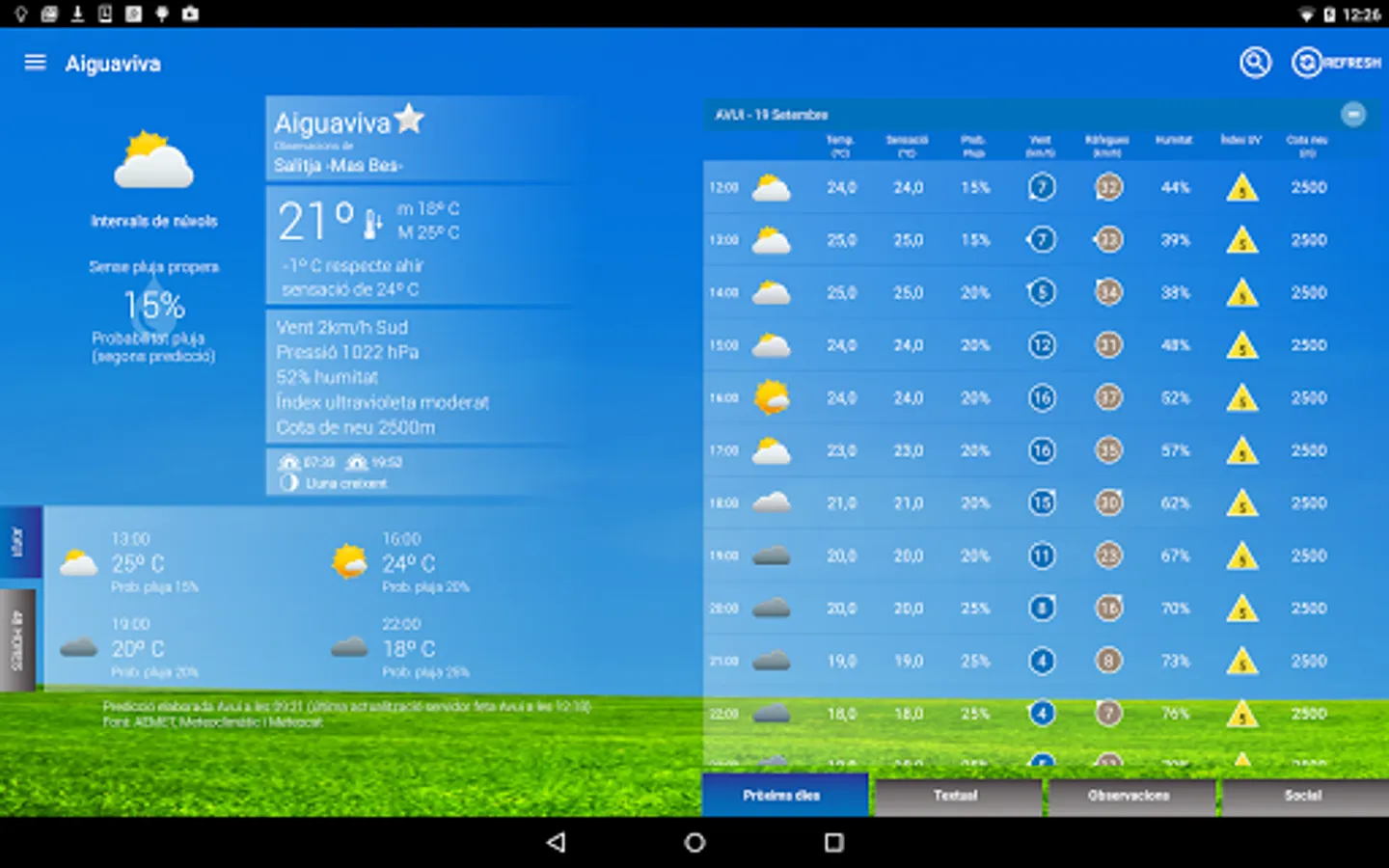 You will be able to obtain information on pluja probability, temperature, temperature sensation, vent, pressió, humitat, ultraviolet index, level of neu, sortida and posta del sol,