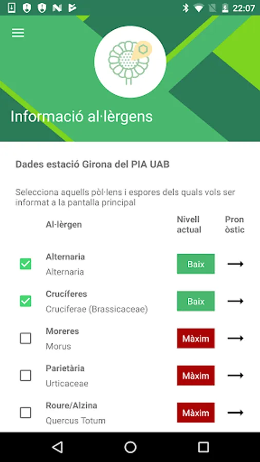 - Aerobiological information on polles and spores according to the PIA of the UAB. That allows people with allergies to keep informed about the allergens they selected.