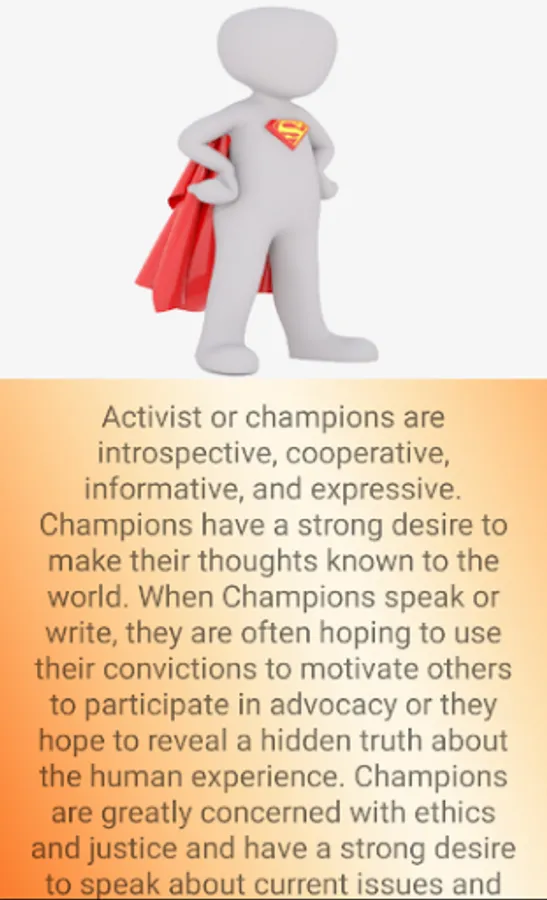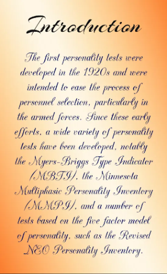 This application lets you do a personality test which examines psychological traits to assess the natural character of each person to identify it in one of the 16 personalities of the Myers-Briggs method.