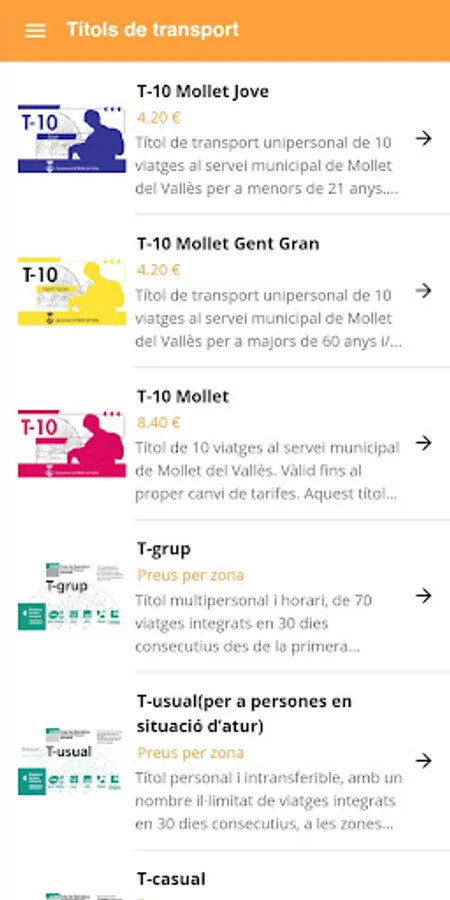 · Tickets: It offers the list of valid tickets for the urban service, with a small description and the price.