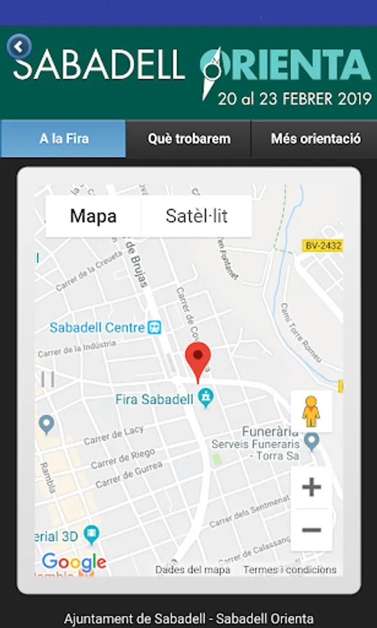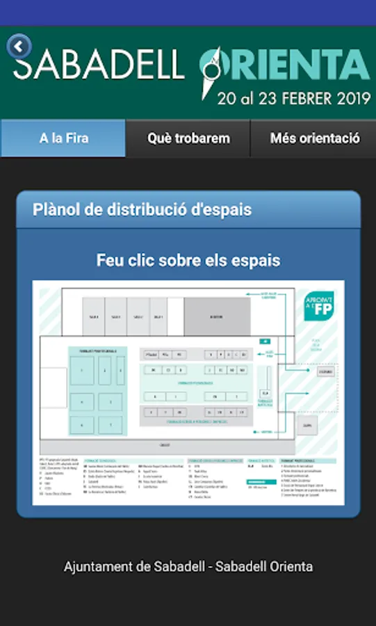 • A plan with the distribution of the spaces according to the areas where the activities are carried out: educational centers exhibition area, unique projects area, business and unions area, the location of the personalized orientation services and the rooms where the professional families of the territory will give talks.