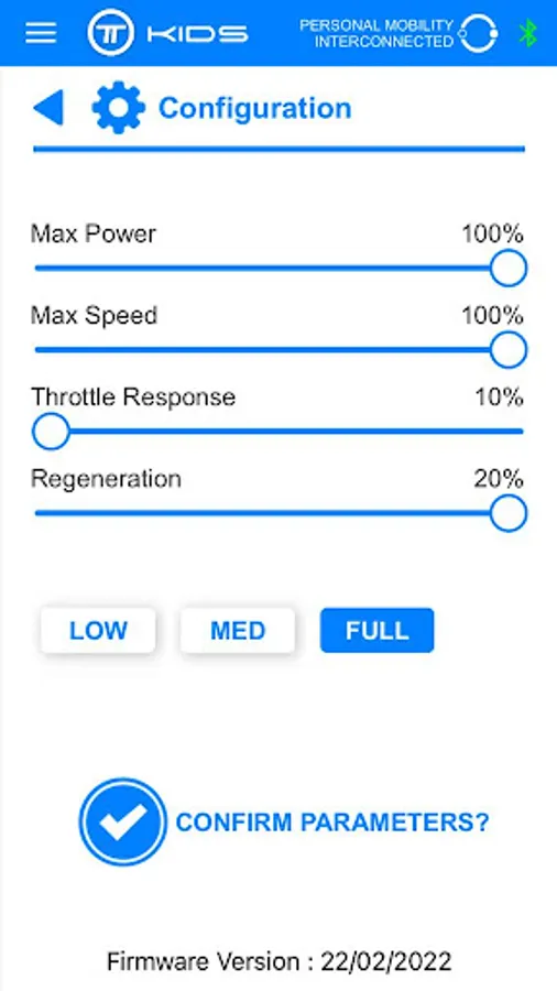 Take the control of your KIDS bike setting different parameters as speed, power, throttle response or regeneration. Through Bluetooth, the app allows you to adapt the bike to the young rider’s level. You can transform the bike setting each parameter or selecting the riding modes available that go from LOW to HIGH, so you can transform the bike from a comfortable ride into a more aggressive one.