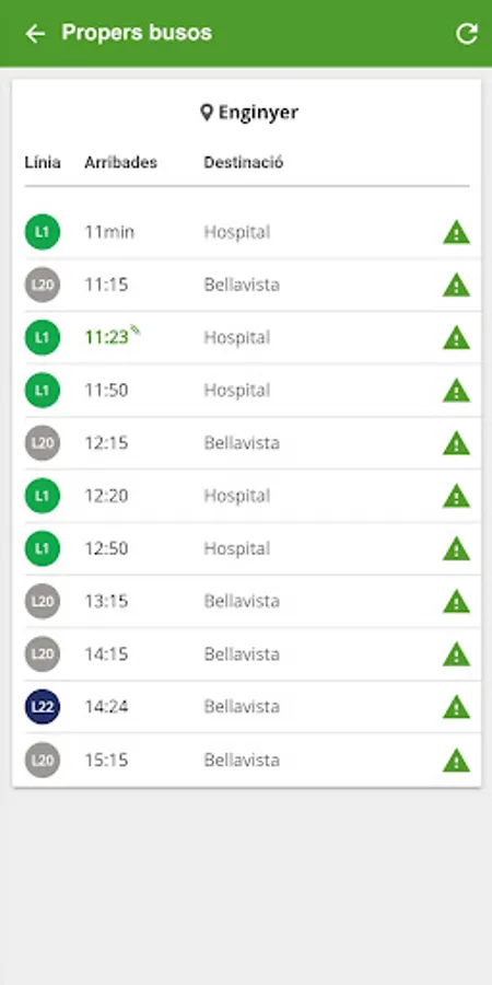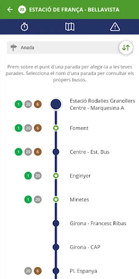 - My stops: Direct access those stops marked as favorites. Clicking on a specific stop time gives you no real next bus and the next scheduled departures. It also allows, check incidents or download a pdf with the complete schedule of the line.