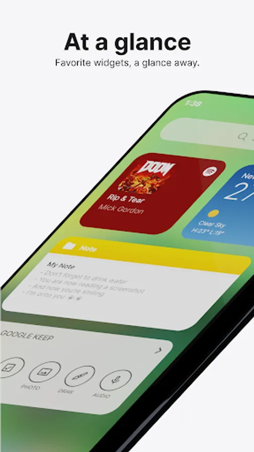 - Favorites page with pre-built customizable widgets including quick note, music, weather and Reddit feed.