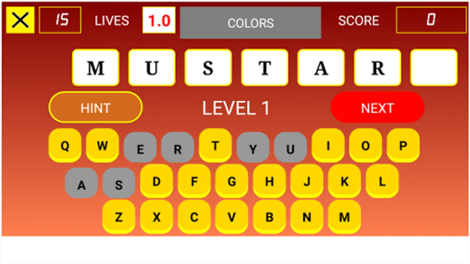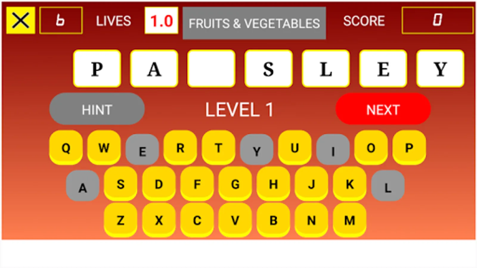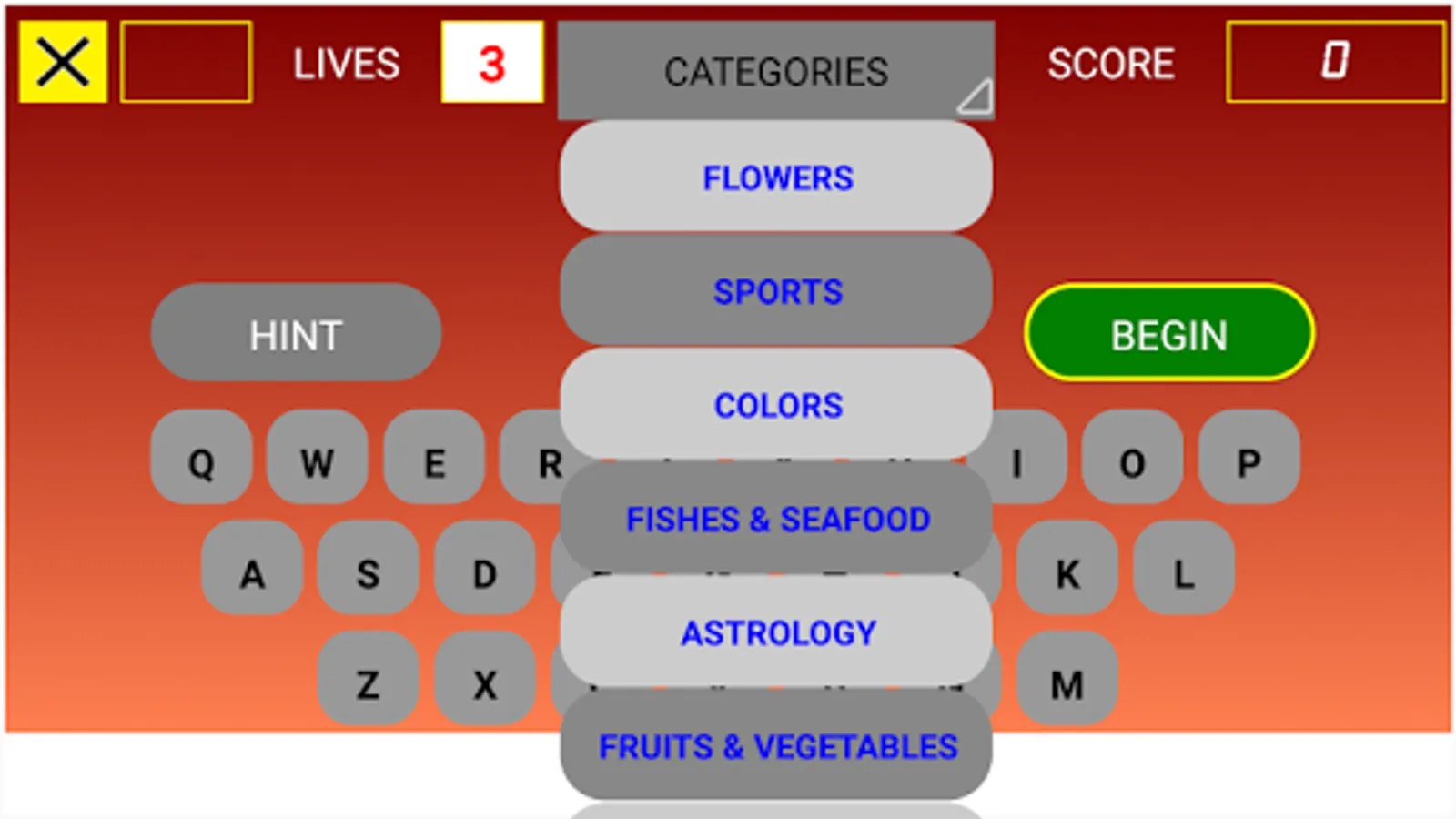 To begin, click on PLAY. Compose the exact word according to the given hints. While playing, you can choose any category in a level and you can change it with the other 2 categories, if you want. At level 1, you have 30 seconds to find the solution. Time is reduced at each level. In levels 1 and 2 you have 4 lives and in levels 3 and 4 you have 3. You will get 5 points for each correct word. The application saves the score when you quit.