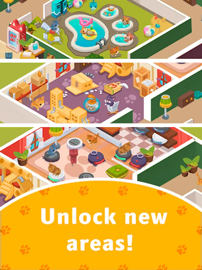 Start with a small theme park, and work on it to make it bigger. Open new areas to create an amazing fun park for your special guests - cats and kitties. Manage wisely the pool area, the carton boxes zone and robot vacuum cleaner room to earn money.