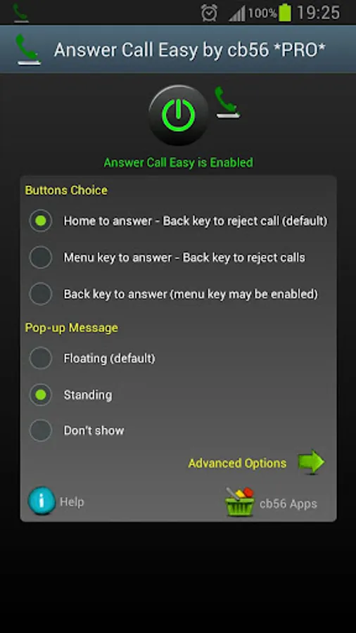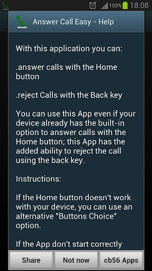 You can use this App even if your device already has the built-in option to answer calls with the Home button; this App has the added ability to reject the call using the back key.