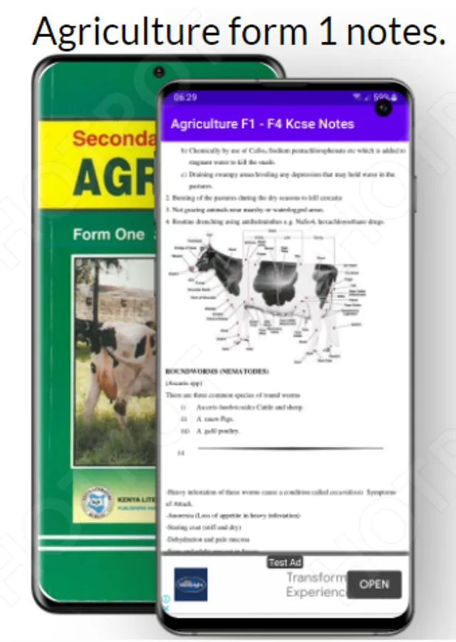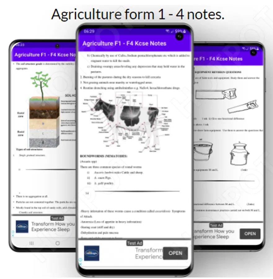 Agriculture: Notes handbook Mobile Application assembles Agriculture Notes beginning from Form One to Form Four within the Syllabus. The application has been developed to equip with the necessary Agriculture skills and knowledge to become an Agriculture Guru. The application also prepares students with the expertise to tackle questions in the KCSE. The App features Topics starting from Form one to form Four.