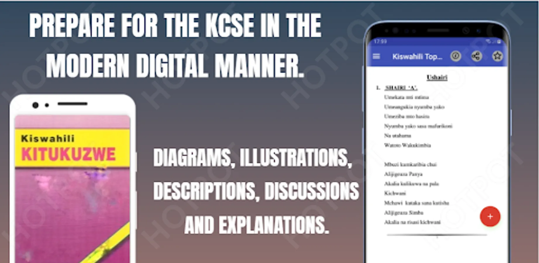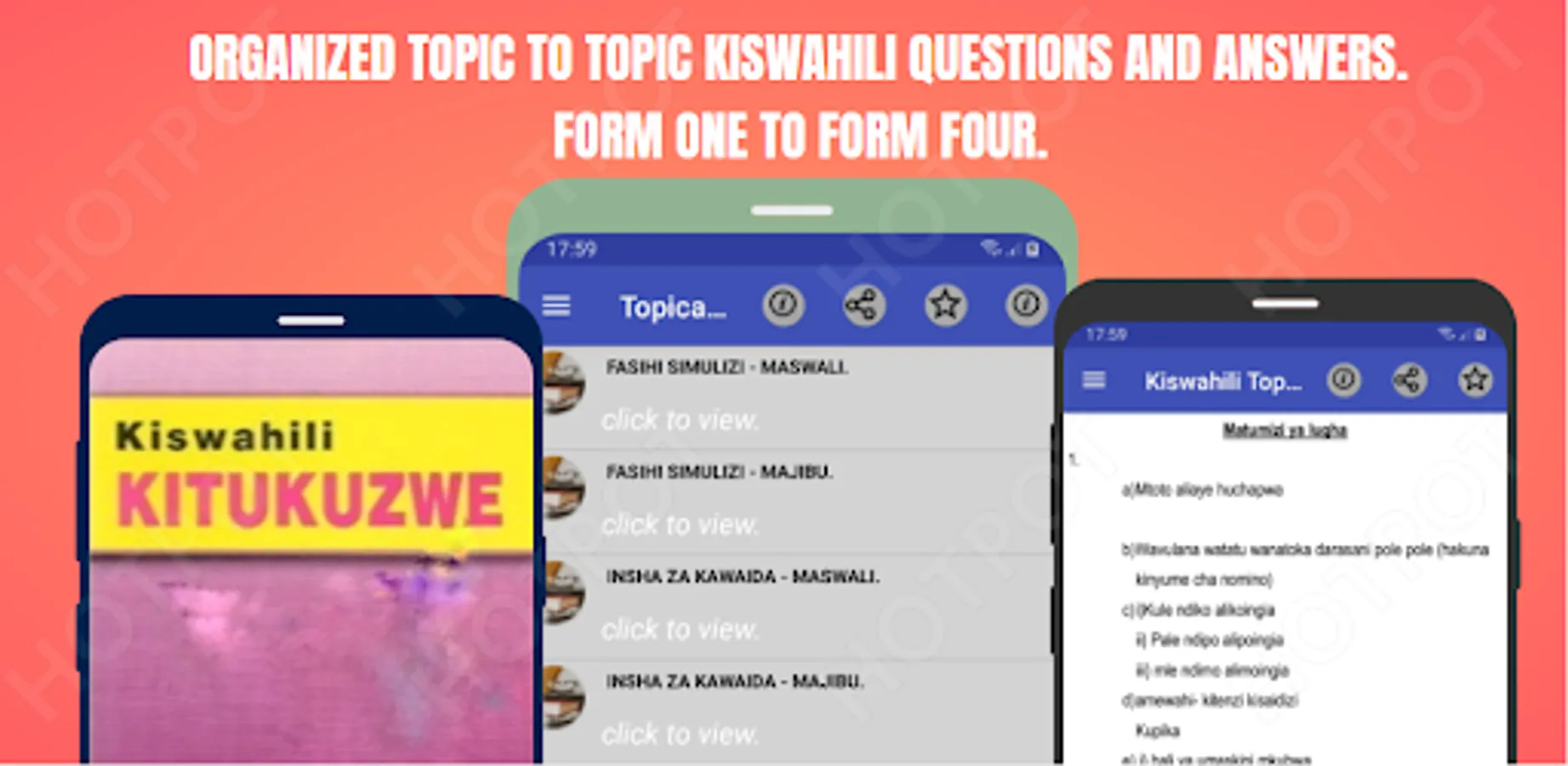 Kiswahili: Topical Questions and Answers Mobile Application is developed to equip learners with Kiswahili KCSE based content. The App gathers Kiswahili Topics beginning from form 1 up to Form 4 . This application features the following Kiswahili Topics: