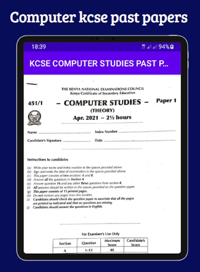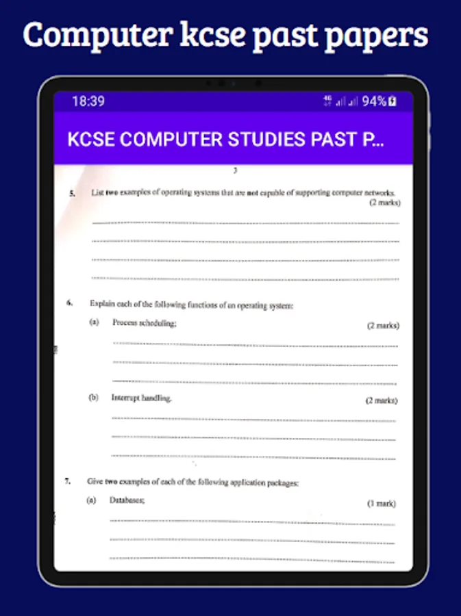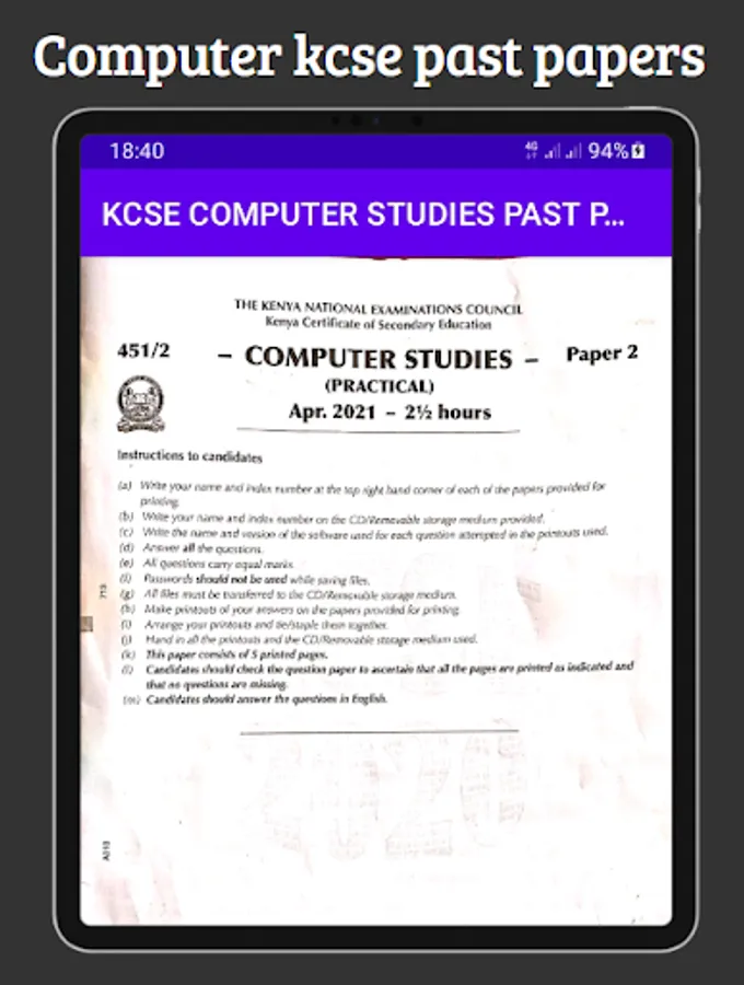 Computer studies Kcse papers app has gathered past computer studies kcse past papers and their respective marking schemes. The application aids learners to gain the experience on how to tackle questions when subjected to the Kcse computer studies exam paper. The application instills confidence to the student since he/ she will provide the necessitated answers and score maximumly