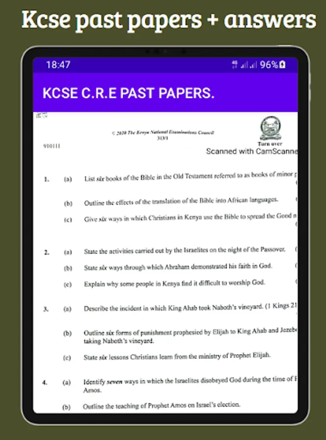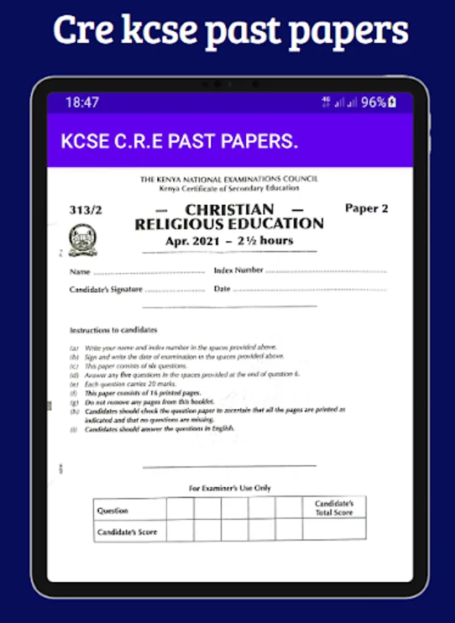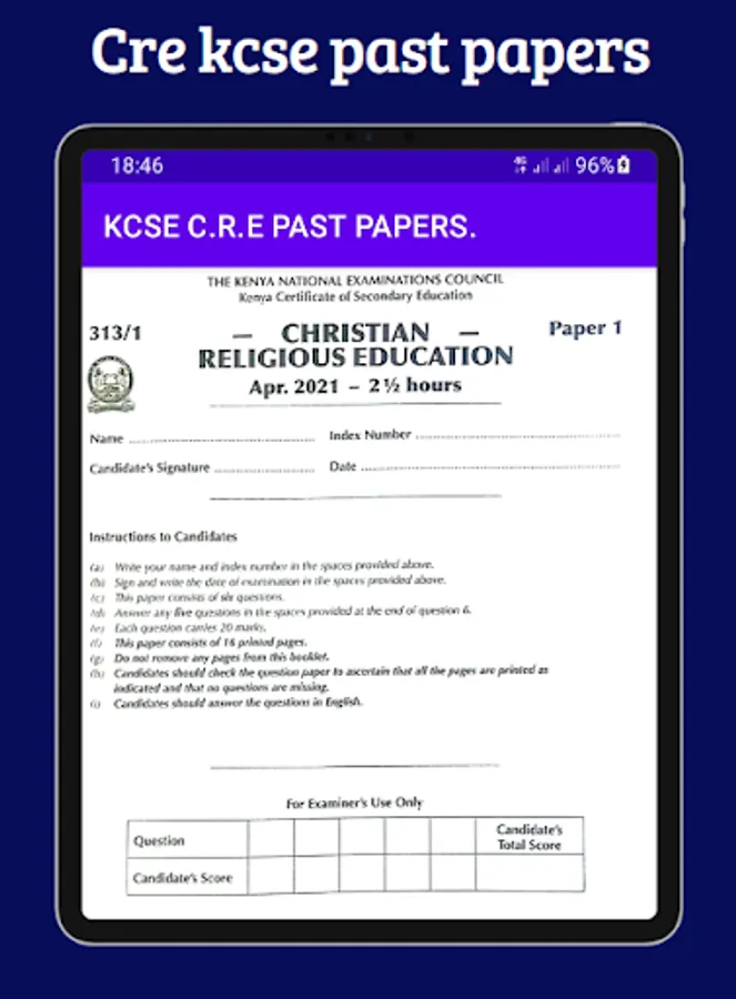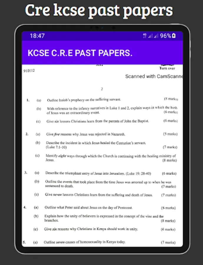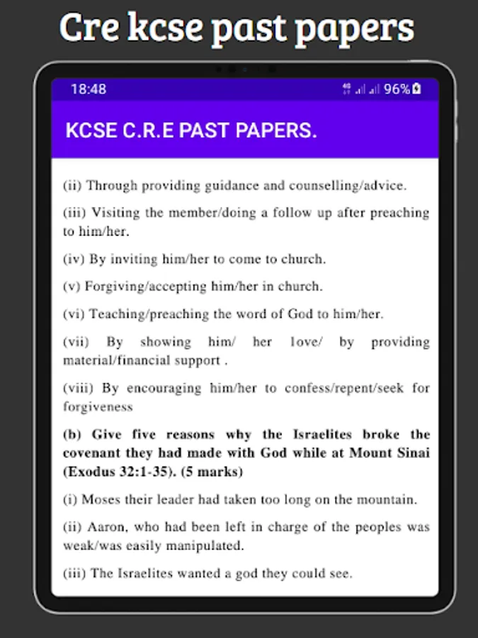 Cre Ksce past papers application has assembled Cre Kcse past papers and their marking schemes. The application is et to equip the user with the experience of a Kcse Cre exam setting. The user learns on how to provide the necessitated answers and will score maximumly given a question in the exam.