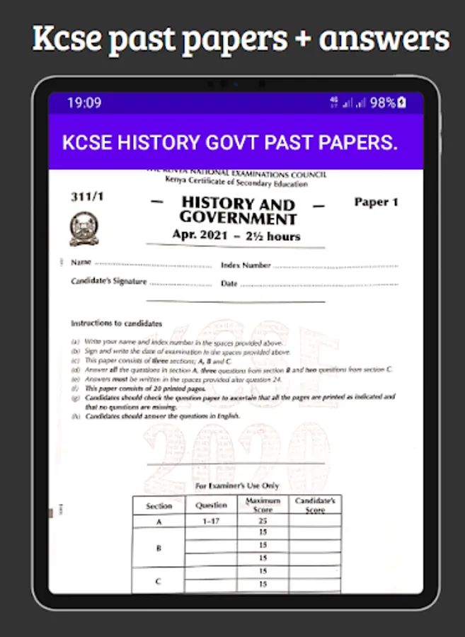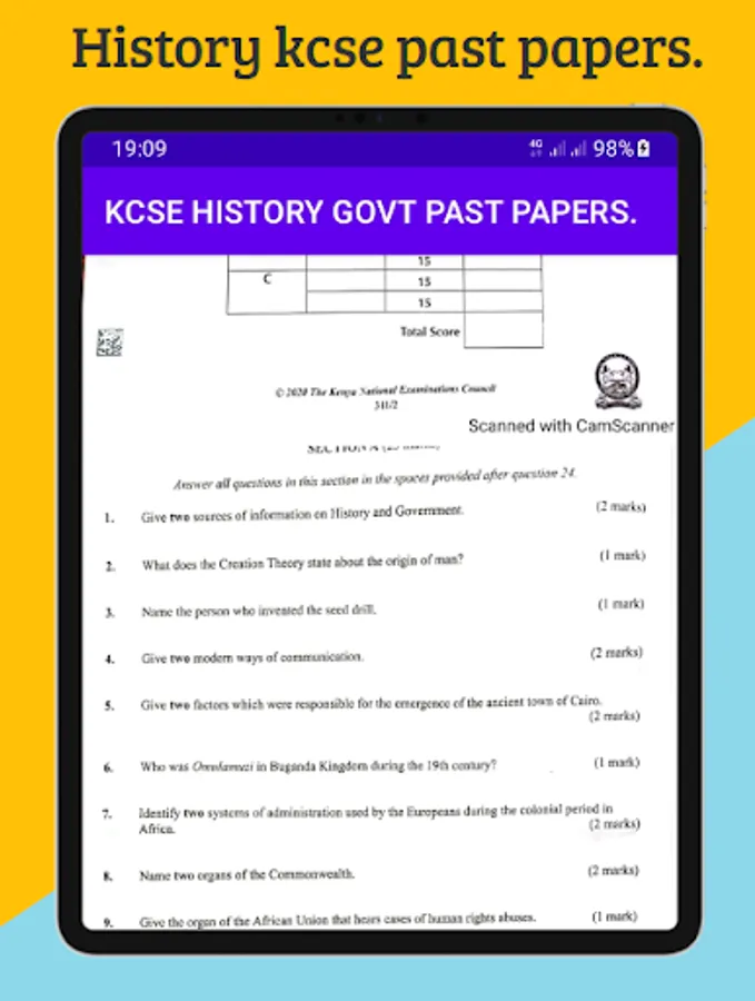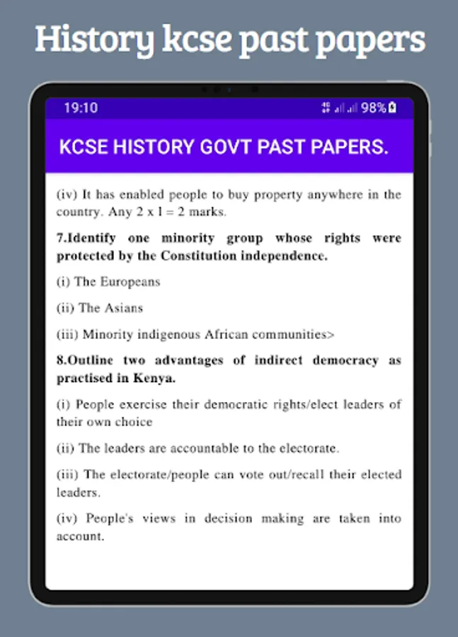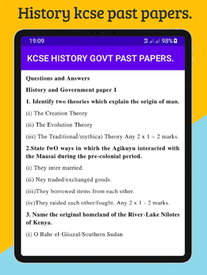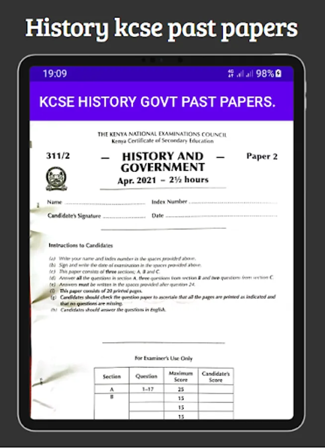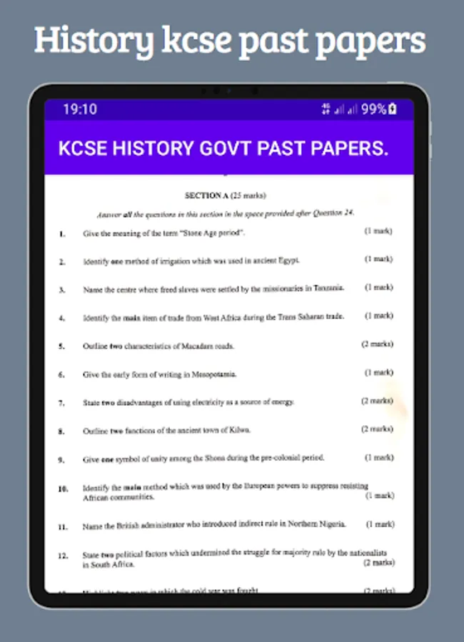 History Kcse past papers application has gathered past Kcse papers and their respective marking schemes. The application familiarizes users with the questions tested in the Kcse exams. The application also gives an insight on the relevant answers the learner should provide to score maximumly on the provided questions.