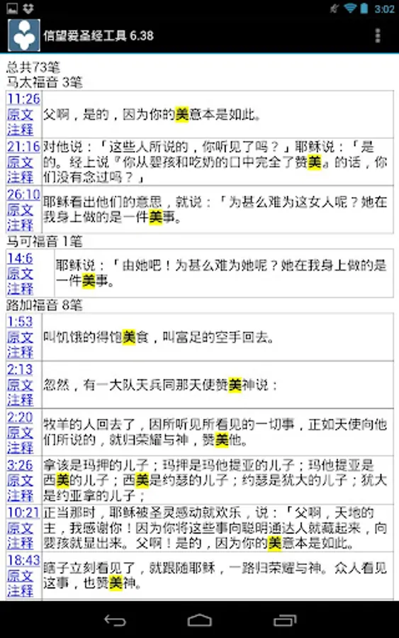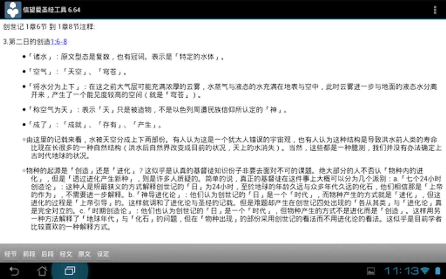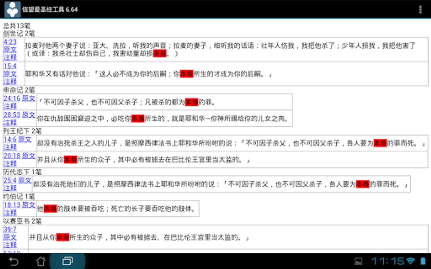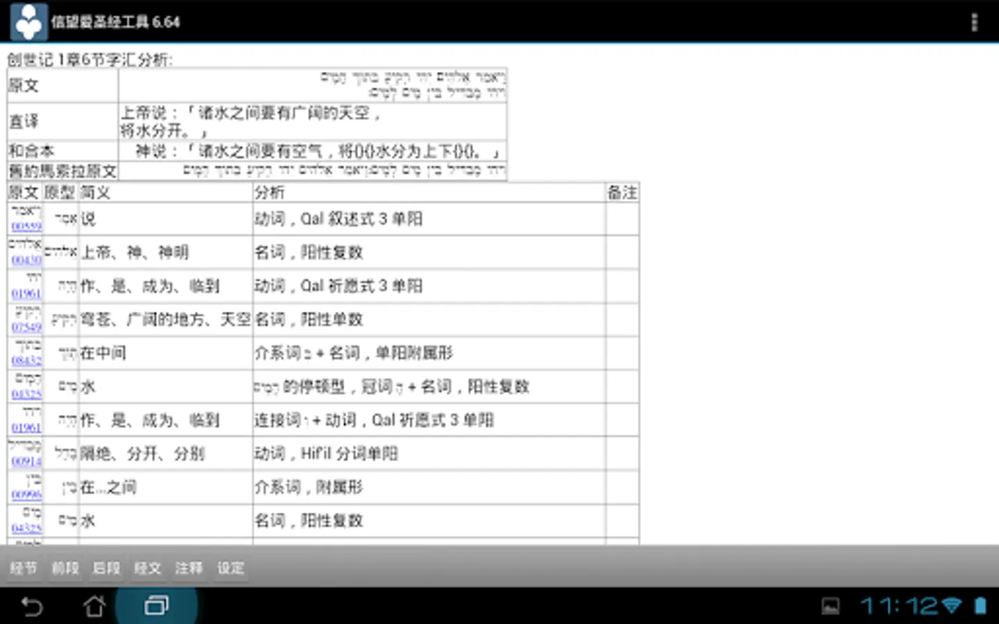 除中文圣经功能外,还具备原文编号、原文字典、字汇分析等原文工具,并有部份经卷之注释功能,适合研经使用。其中注释与字汇分析是透过网路撷取信望爱站的资料,需在网路连接的状态下才能运行。