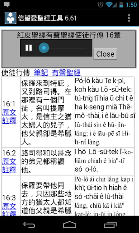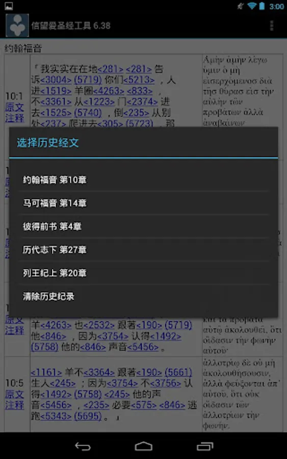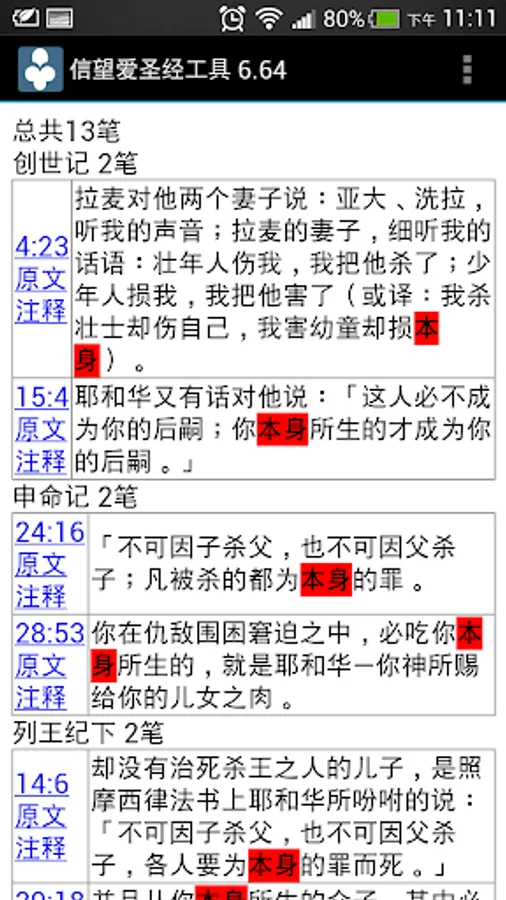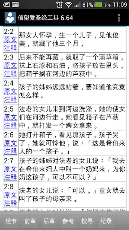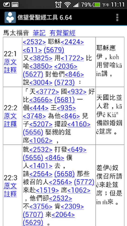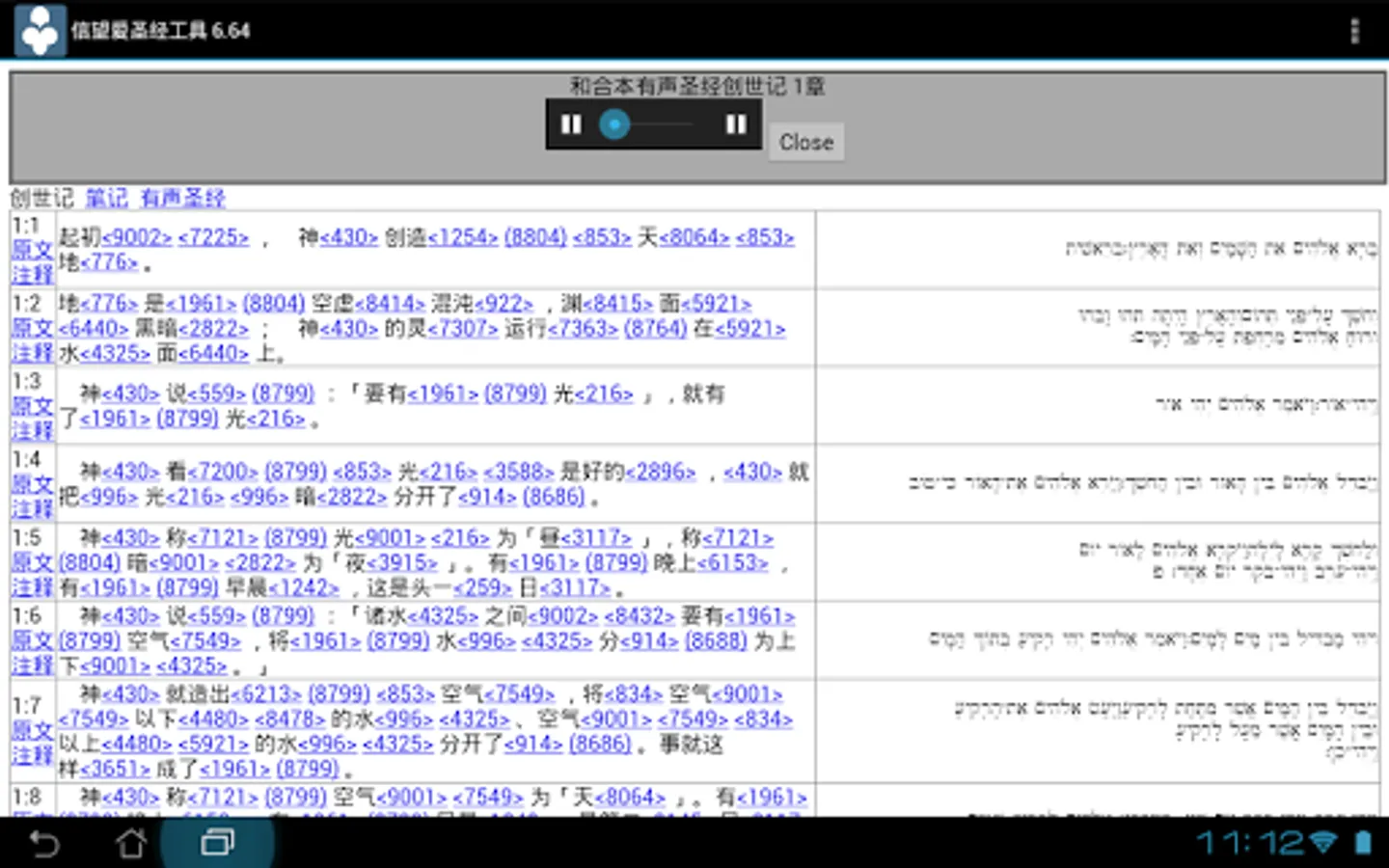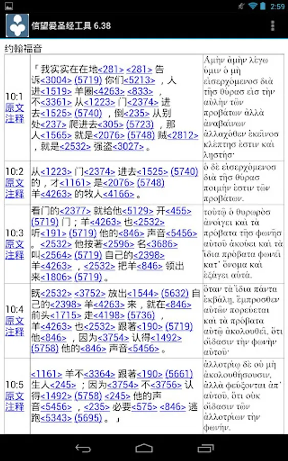 除中文圣经功能外,还具备原文编号、原文字典、字汇分析等原文工具,并有部份经卷之注释功能,适合研经使用。其中注释与字汇分析是透过网路撷取信望爱站的资料,需在网路连接的状态下才能运行。