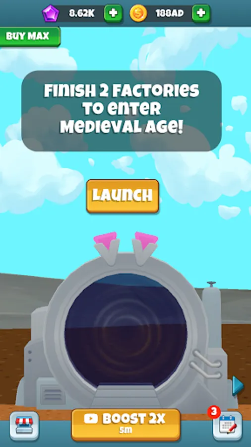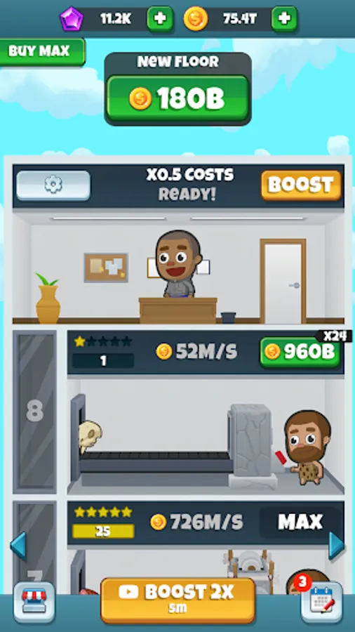What better way to get ahead of the competition than by getting an early start, and what’s earlier than the stone age!? Hire cavemen to work in your factory and do the heavy lifting to grow your business. Upgrade your factory to move forward in time and hire more workers in each age to grind out more and grow your business. Keep your eyes on the prize and build a business that will last into the future and beyond!