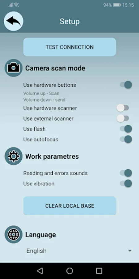 There is an option to check the DocTracker cloud connection and user status, enable or disable the use of hardware buttons for scanning and confirmation, use the built-in hardware scanner, use the backlight and camera autofocus. Also, in the work settings, you can choose to turn on or turn off sounds during scanning and errors, vibration.