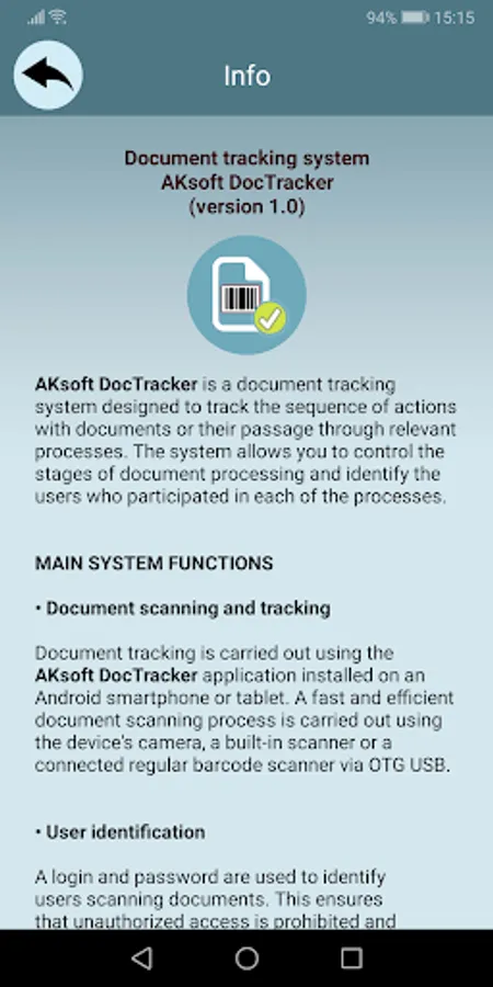 Document tracking is carried out using the AKsoft DocTracker application installed on an Android smartphone or tablet. A fast and efficient document scanning process is carried out using the device's camera, a built-in scanner or a connected regular barcode scanner via OTG USB.