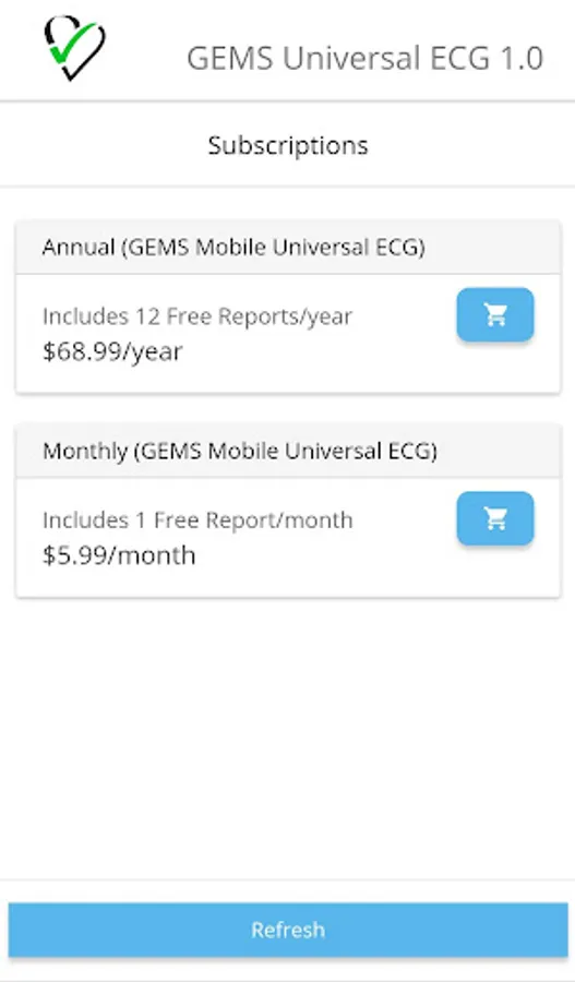 GEMS™ Universal ECG is free for download but requires monthly/annual subscription in order to record new ECG data. When paired with a supported ECG device, GEMS™ Universal ECG allows you to view, print and send your ECG for medical review. Professionally reviewed results are available for a fee and are received in as little as 30 minutes. The results can indicate the presence or absence of more than four dozen heart arrhythmias, including atrial fibrillation and QT prolongation. Subscriptions come with one physician review per month included. You can also see your ECG print-out in near real-time at no additional cost to be shared with a healthcare professional.
