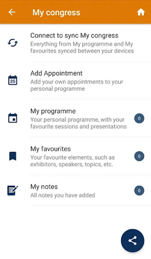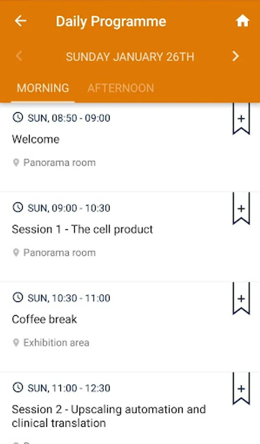 - Content and Logistic: daily programme (agenda) of the meeting, abstract book, possibility to take notes, add personal favourites elements: exhibitors, speakers, topics; floor plan of the venue and the exhibition area;