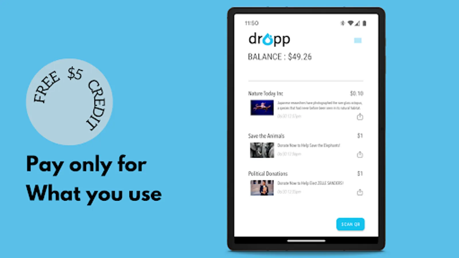 Dropp’s pay-per-use micropayment services gives users the power to purchase goods and services for as low as $0.01. Pay for a cup of coffee, parking to data access with ease.